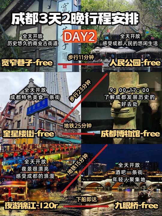 DAY2:宽窄巷子-I人民公园-奎星楼街-成都博物馆-夜游锦江-九眼桥