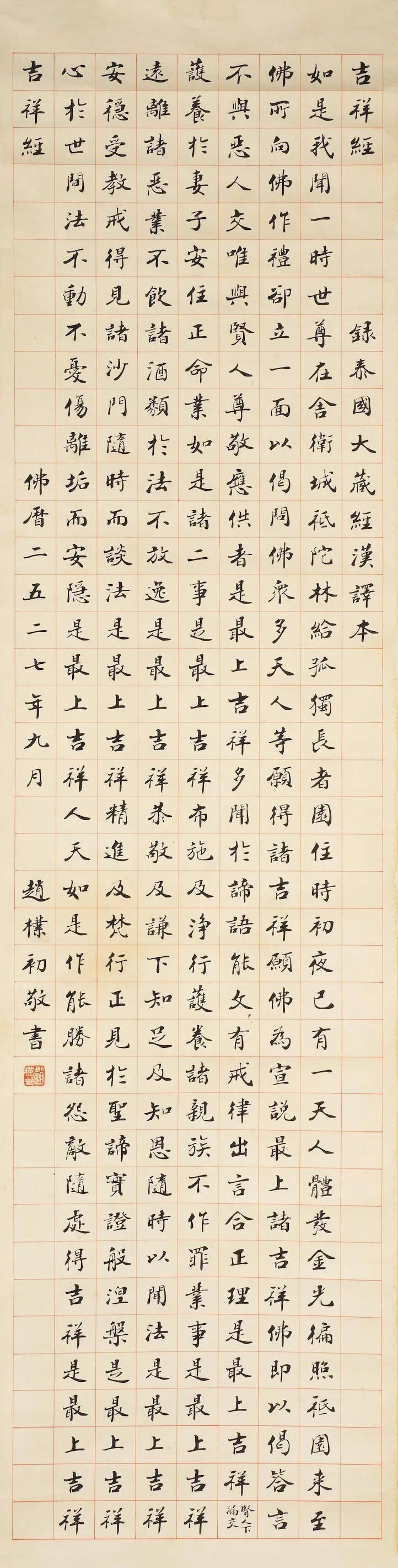 赵朴初先生书《吉祥经》。趙樸初吉祥經橫批,水墨紙本, 鏡框,32 x 131cm。款識:佛曆二五三五年(1991)七月二十四日。趙樸初書。