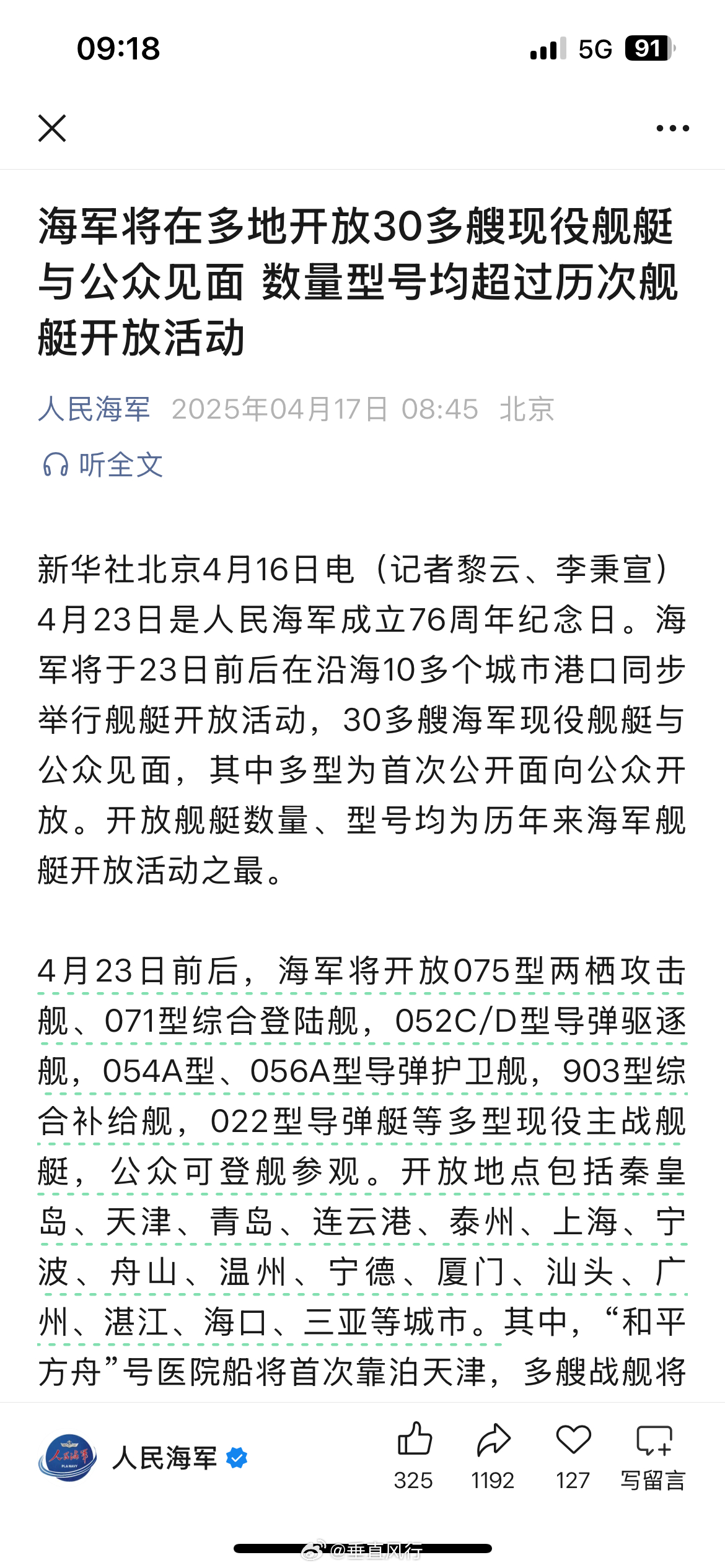 官宣:075将首次开放。人民海军官号发文:4月23日前后,海军将开放075型两栖攻击舰、071型综合登陆舰,052C/D型导弹驱逐舰,054A型、056A型导弹护卫舰,903型综合补给舰,022型导弹艇等多型现役主战舰艇,公众可登舰参观。开放地点包括秦皇岛、天津、青岛、连云港、泰州、上海、宁波、舟山、温州、宁德、厦门、汕头、广州、湛江、海口、三亚等城市。