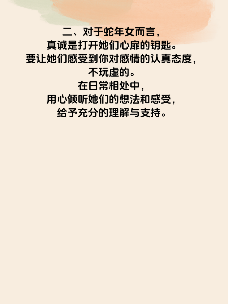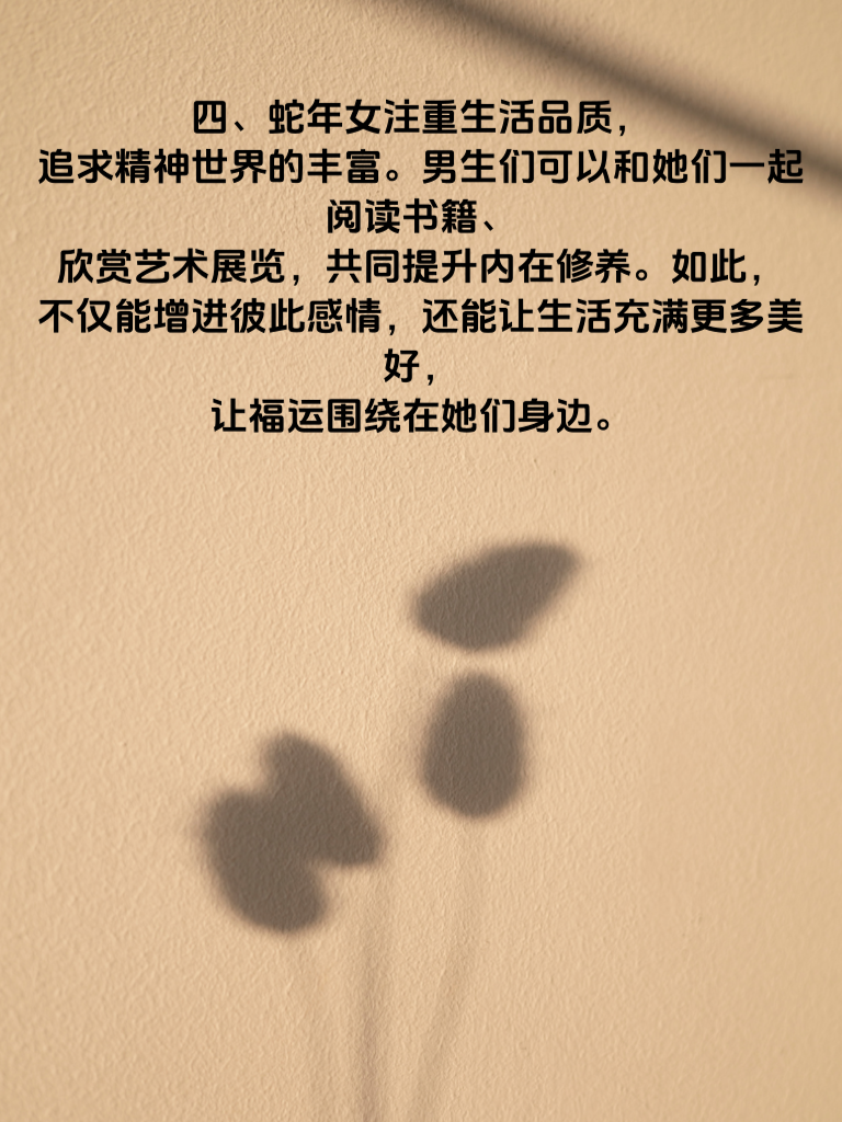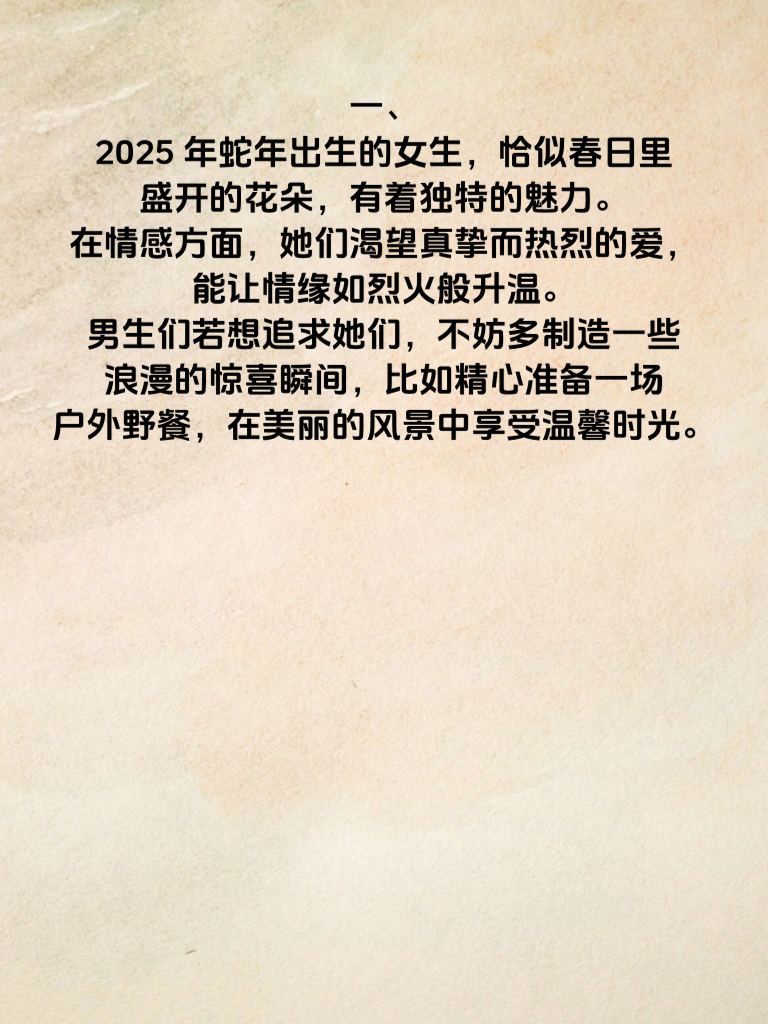 一、2025 年蛇年出生的女生,恰似春日里盛开的花朵,有着独特的魅力。在情感方面,她们渴望真挚而热烈的爱,能让情缘如烈火般升温。男生们若想追求她们,不妨多制造一些浪漫的惊喜瞬间,比如精心准备一场户外野餐,在美丽的风景中享受温馨时光。 二、对于蛇年女而言,真诚是打开她们心扉的钥匙。要让她们感受到你对感情的认真态度,不玩虚的。在日常相处中,用心倾听她们的想法和感受,给予充分的理解与支持。 三、而在事业财运方面,她们往往有着自己的追求且聪慧过人。男生们可以鼓励她们勇敢追寻梦想,在她们为事业拼搏时给予肯定。同时,也可以一起探讨理财之道,说不定能助力她们财路顺遂,收获满满的福气。 四、蛇年女注重生活品质,追求精神世界的丰富。男生们可以和她们一起阅读书籍、欣赏艺术展览,共同提升内在修养。如此,不仅能增进彼此感情,还能让生活充满更多美好,让福运围绕在她们身边。