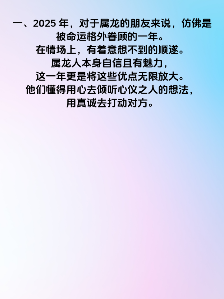 一、2025 年,对于属龙的朋友来说,仿佛是被命运格外眷顾的一年。在情场上,有着意想不到的顺遂。属龙人本身自信且有魅力,这一年更是将这些优点无限放大。他们懂得用心去倾听心仪之人的想法,用真诚去打动对方。 二、比如在与异性相处时,属龙人会敏锐地捕捉对方的喜好。精心准备的小惊喜,恰到好处的关心问候,都让他们在情场中如鱼得水。不再是盲目地追求,而是有策略地靠近,一步步走进对方的内心世界。 三、而在财路上,2025 年的属龙人同样有着畅通无阻的运势。他们凭借着自身的智慧和果敢,能精准地抓住各种商机。不再犹豫,果断出击,收获满满的财富。 四、无论是大胆投资新项目,还是巧妙利用人脉资源,属龙人都能做得游刃有余。他们积极进取的态度,加上这一年的好运加持,让财路越走越宽,真正实现财路畅通无极限,为自己和心爱的人创造更美好的生活。
