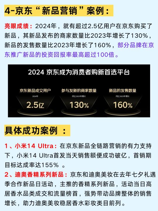 本篇图文主要拆解了万亿级电商大厂“京东的新品战略”,以及京东是如何通过多元策略将新品一步步打造成爆品的。 - 图二内容:介绍什么是“京东新品百千亿计划”以及针对“新品”的扶持目标。 - 图三内容:解读京东小魔方升级为京东新品 - 图四内容:总结京东推出的“新品全链路营销2.0全景图”(实际就是京东要帮品牌更快地把新品卖成爆款,而且还要让这些爆款能持续火下去,不只是短期的热度而是能长期卖得好) - 图五内容:京东新品营销及爆品增长案例