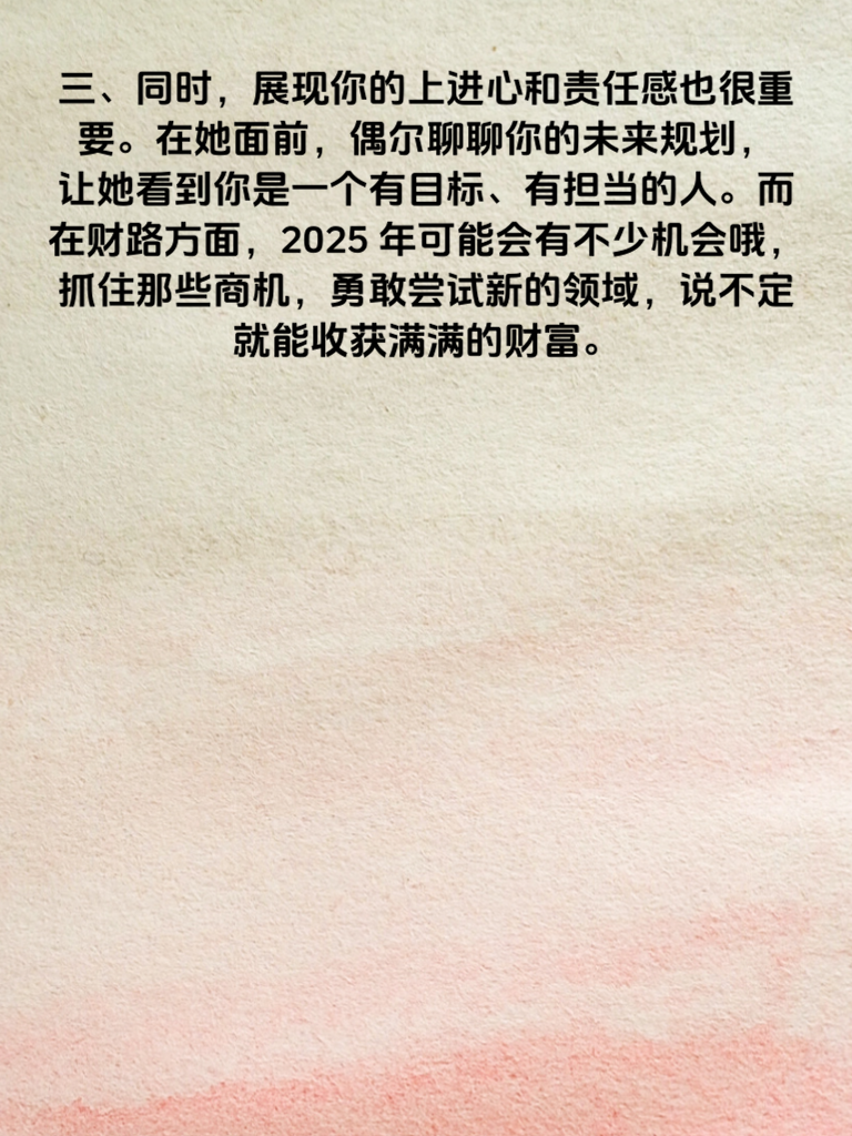 一、嘿,属猴的小伙伴们!2025 年可是你们的幸运年哦,桃花和财路都要双开挂啦!在这一年里,爱情或许会悄然降临。要相信自己的魅力,积极主动地去拓展社交圈。多参加一些有趣的活动,说不定就能遇到那个让你心动的 Ta。 二、对于追求女生来说,真诚是永远的必杀技。不要试图用花言巧语去哄骗,而是用真心去对待她。了解她的喜好,在特殊的日子送上一份贴心的小礼物,比如她喜欢的书籍或者美食。 三、同时,展现你的上进心和责任感也很重要。在她面前,偶尔聊聊你的未来规划,让她看到你是一个有目标、有担当的人。而在财路方面,2025 年可能会有不少机会哦。抓住那些商机,勇敢尝试新的领域,说不定就能收获满满的财富。 四、记住,无论是爱情还是事业,都需要我们用心去经营。属猴的你有着聪明的头脑和灵活的应变能力,只要保持积极乐观的心态,2025 年成为人生赢家绝对不是梦!