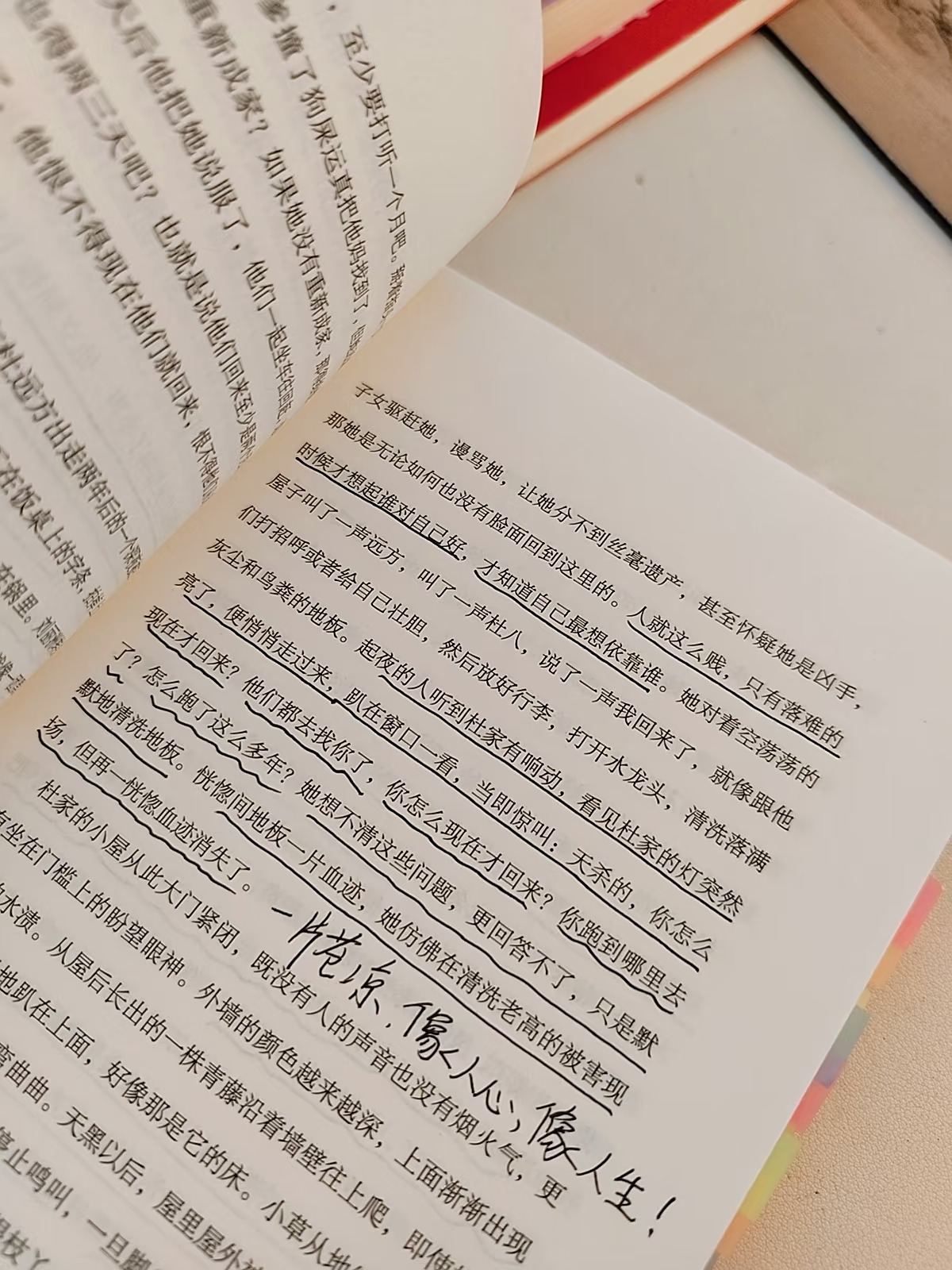 人性的善与恶、对与错、是与非;人与人之间的各种情:爱情、亲情;每一个疲惫灵魂深处的喜悦、悲辛、爱与恨,无奈与心酸…都在这本书中被无限放大!!
