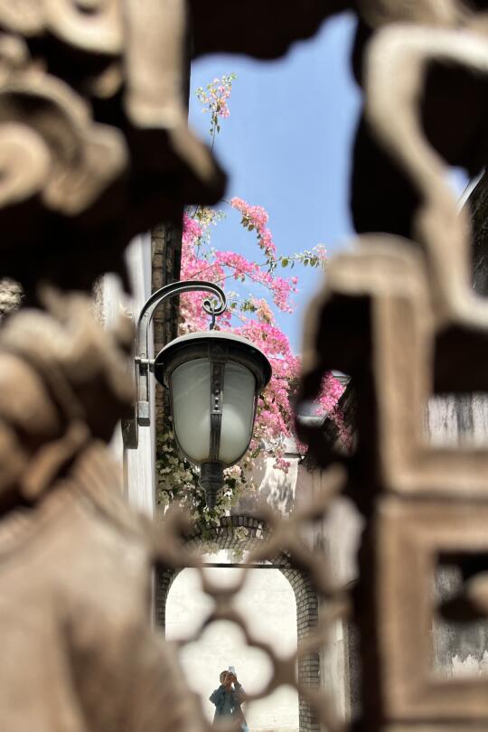 在赏花时,意外发现一个超级好拍的隐藏机位:就在花墙门洞往里走,其北侧墙边有个入户门,轻轻拉开门外的镂空门,对准三角梅,花影随着活泼灵动的镂空界面,变得有趣生动起来。