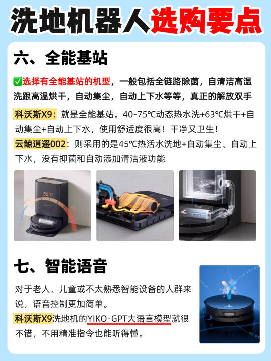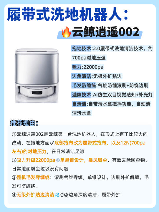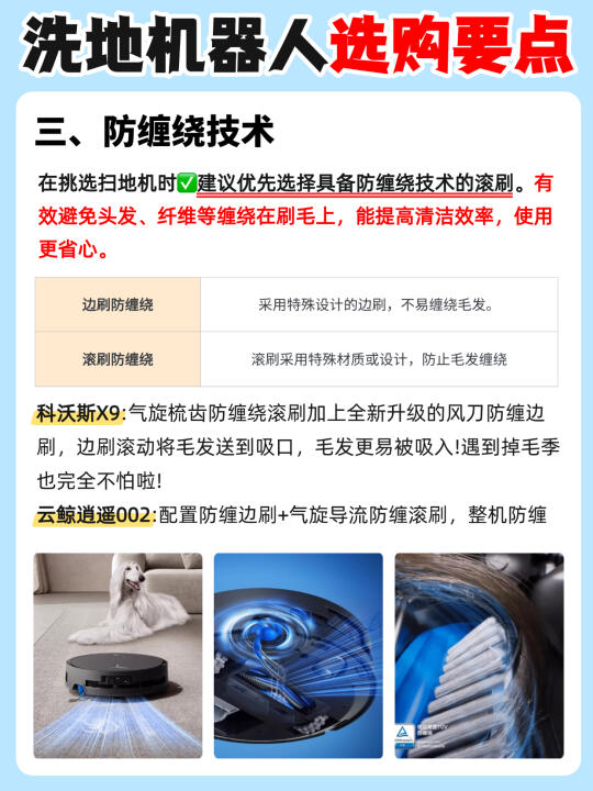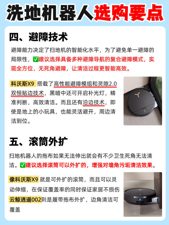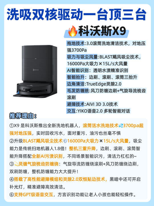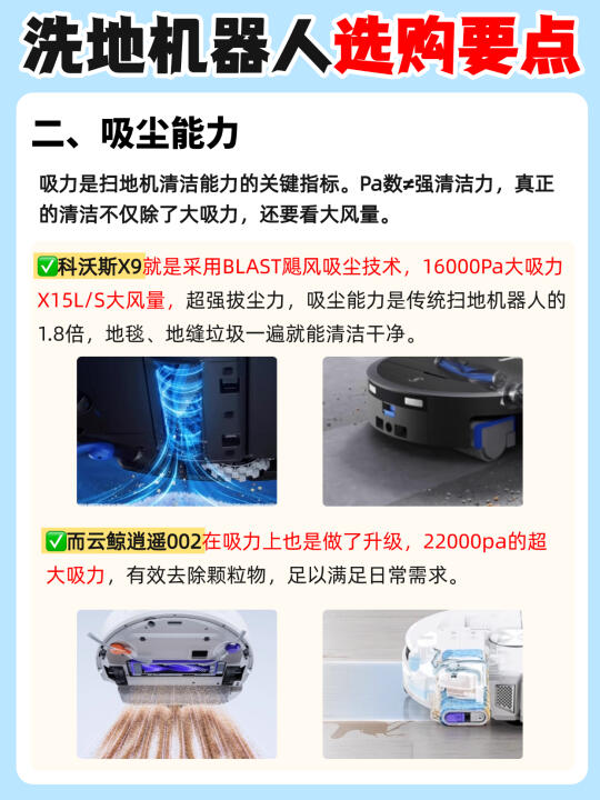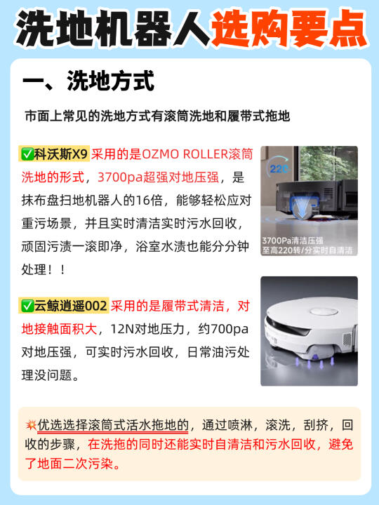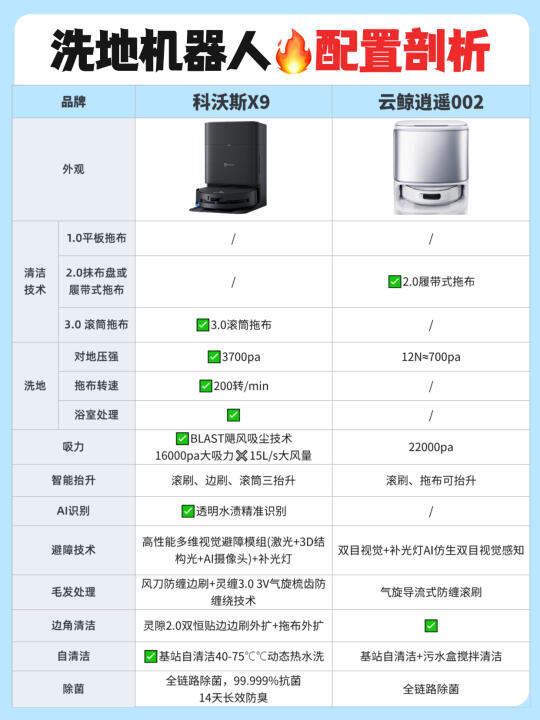 现在的洗地机器人简直强的可怕啊…… 全屋地面轻松搞定,连后期维护都不用你操心! 但是不是真的像他们宣传的那么强❓测了才知道! 今天橙子给大家带来2️⃣款热门的洗地机器人,看完就知道该怎么选了! - ✅清洁技术: 👉🏻科沃斯X9 :3.0滚筒洗地技术,3700pa超强对地压强,是抹布盘扫地机器人的16倍,能够轻松应对重污场景 👉🏻云鲸逍遥002:采用的是传统2.0履带式清洁,对地接触面积大,12N对地压力,约700pa对地压强 - ✅吸尘能力: 👉🏻科沃斯X9:采用BLAST飓风吸尘技术16000pa大吸力✖️15L的巨大风量,地毯、地缝里的粉尘颗粒也能轻松吸走! 👉🏻云鲸逍遥002:在吸力上也是做了升级,22000pa的超大吸力,有效去除颗粒物,可以满足日常需求。 - ✅防缠绕技术: 👉🏻科沃斯X9:气旋导流防缠绕滚刷+风刀防缠绕边刷,防缠能力大大提升,轻松做到毛发0缠绕! 👉🏻云鲸逍遥002:配置气旋导流防缠滚刷,毛发有效防缠! 除了以上三点主要区别,还有在✔️避障技术✔️滚筒✔️基站✔️智能语音的区别,都给大家整理在图上了!感兴趣的朋友可以自己观看哦~ - 💡本人pick: 目前从各方面综合来说,我个人更喜欢🔥科沃斯X9!属于是1台顶3台,全场景清洁选手! 1️⃣沿用了去年口碑爆款X8的💦滚筒活水洗地技术,3700pa超强对地压强,污水实时回收,绝对不会以脏拖脏!面对重污也能轻松处理干净! 2️⃣升级BLAST飓风💨吸尘技术:16000Pa大吸力✖️15L/s大风量力,吸尘能力是传统扫地机器人1.8倍! 3️⃣整机三重升降,边刷、滚刷、滚筒智能升降搭配全新AI污渍识别,根据识别到的污渍类型💧采取对应的清洁策略,不仅能清洁干净还特别省心~ 4️⃣灵缠气旋梳齿防缠绕:气旋导流防缠绕滚刷+风刀防缠绕边刷,双刷防缠,整机防缠能力大大提升! 5️⃣搭载💫AIVI3D 3.0技术和灵隙2.0双恒贴边技术,黑暗中开启补光灯,精准避障高效清洁;而且还有贴边技术,毫米级贴障不漏扫 今天橙子的推荐就到这里啦,有什么问题欢迎评论区 - 科沃斯云鲸科沃斯X9云鲸逍遥002扫地机器人推荐洗地机器人装修好物清洁神器智能家居选购攻略