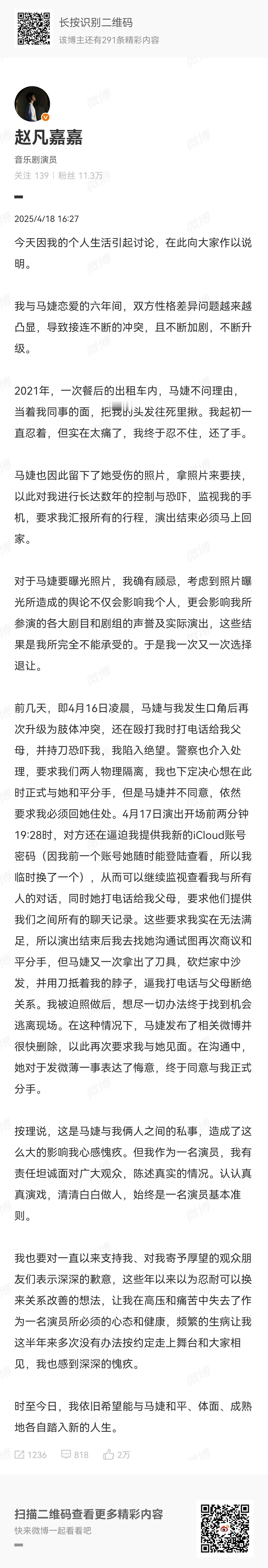 马婕回应赵凡嘉:“昨天的微博我看到了,我不承认但是我理解,你想为自己寻求一丝生路,不管是前几天还是今天,我的诉求非常简单,我想要一个理,这一年以来,我和赵凡嘉从来没有分手过,但是因为他父母的干涉,他妈妈在上海开了一个酒店哭着求他分手,说全家就指望他了,爸爸要去当保安了,不得已他说要和外界说我们已经分手了,无数次经历了你所谓的“马婕死缠烂打,马婕不要脸”,都容忍了,我想你好,关于为什么看手机,是因为他父母来家里的时候他把我支开,并且把我的衣物和鞋子藏起来骗他爸妈,被我发现了,感觉不对,才去看的,也是因此从而发现了她,没错,就是粉来那位”