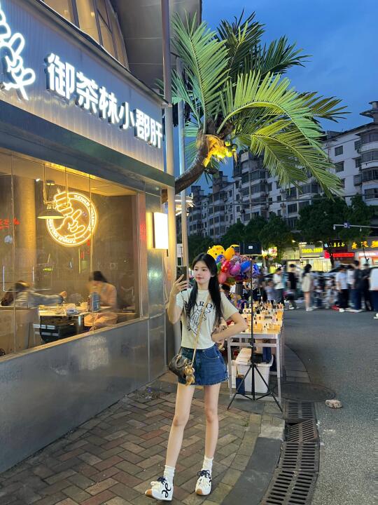 夜晚的都市街头简直是拍照的宝藏地。前几天我就看到一个黑衣少女在街头自拍,那时尚感