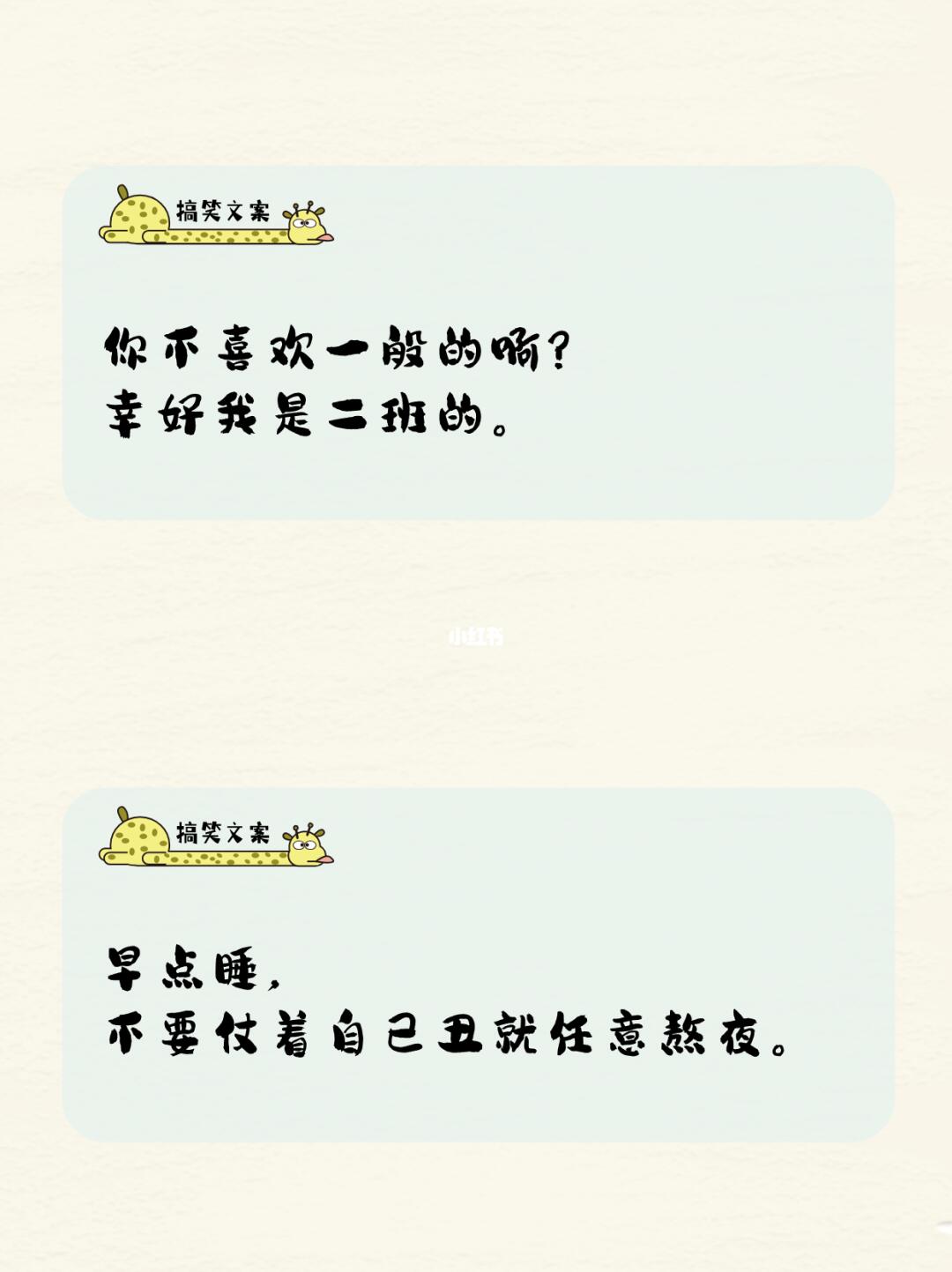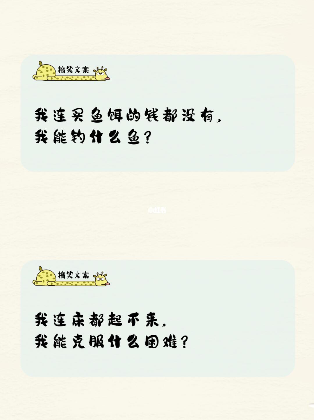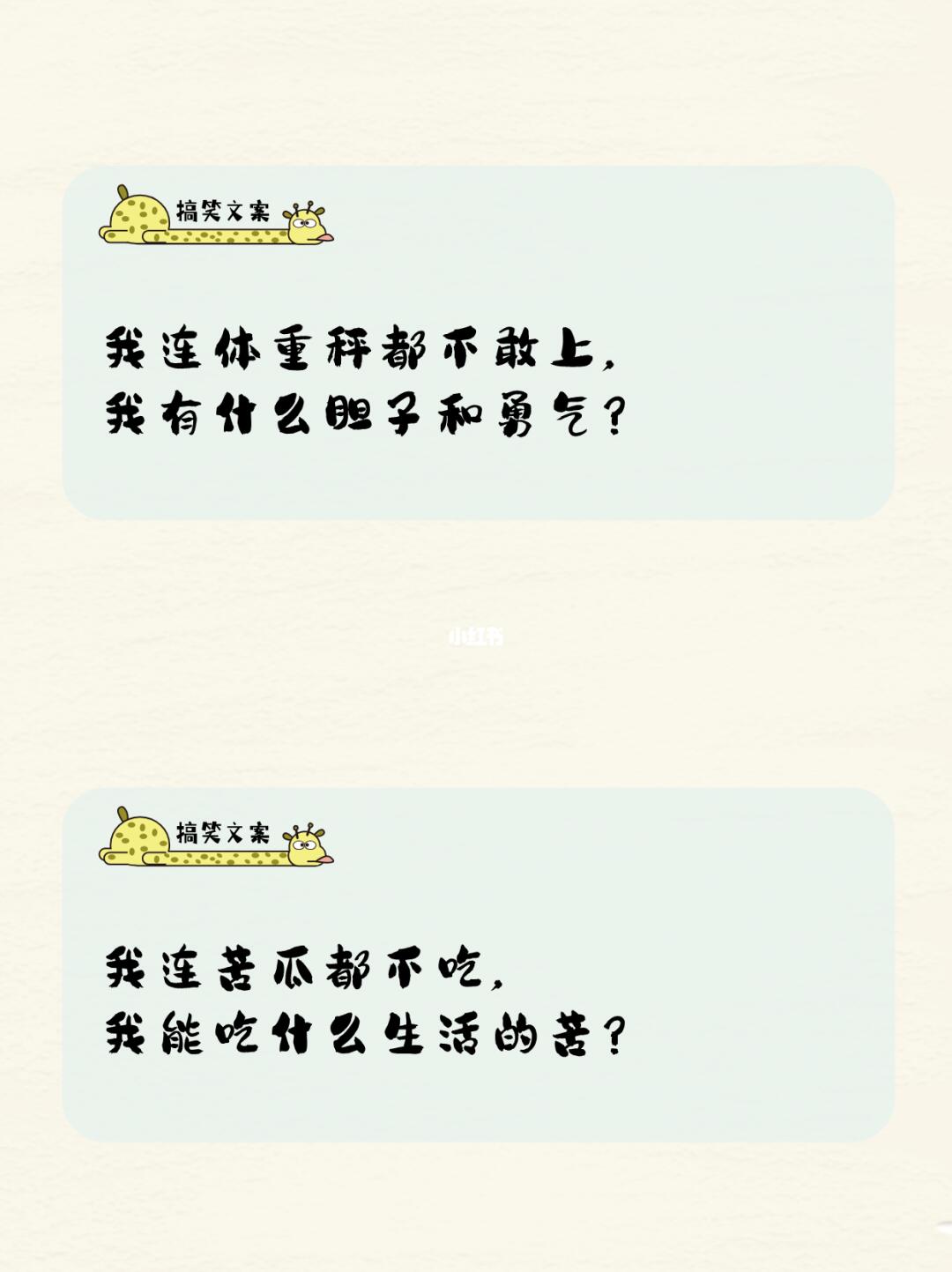 🎉我连体重秤都不敢上,我有什么胆子和勇气? 🎉我连苦瓜都不吃,我能吃什么生活的苦? 🎉我连买鱼饵的钱都没有,我能钓什么鱼? 🎉我连床都起不来,我能克服什么困难? 🎉漂亮的话我不会说,但漂亮的我正在说话。 🎉网课我看不进去,网恋我倒是可以试试。 🎉你不喜欢一般的啊?幸好我是二班的。 🎉早点睡,不要仗着自己丑就任意熬夜。 发癫文案 颠公 搞笑日常 日常生活里的快乐瞬间 搞笑句子 笑掉大牙的搞笑句子 上头的句子 幽默句子