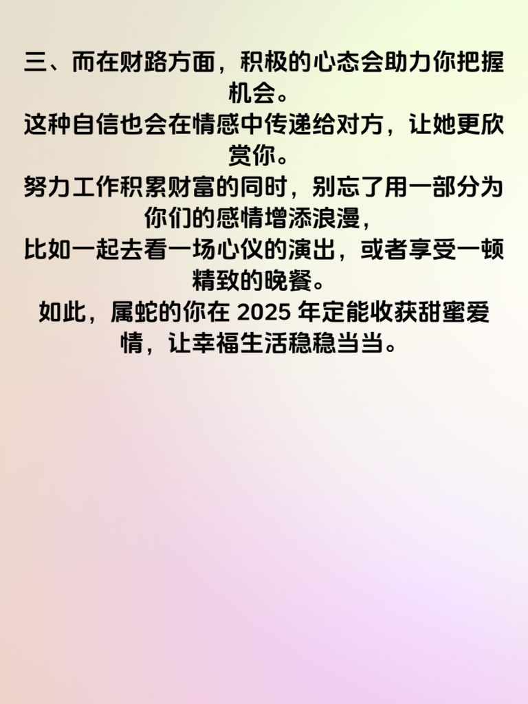一、2025 年对于属蛇的人来说,是充满惊喜的一年,桃花与财路双开运,幸福生活愈发稳固。在情感方面,属蛇的你魅力四射,会吸引到众多异性的目光。你自身的智慧与冷静,让你在与他人相处时游刃有余。 二、追求女生时,不妨利用这一年的好运势,展现真实的自己。用你的才情去打动她,比如在聊天时分享一些有趣的见闻或独特的见解。在约会中,注重细节,为她准备一份小惊喜,会让她感受到你的用心。 三、而在财路方面,积极的心态会助力你把握机会。这种自信也会在情感中传递给对方,让她更欣赏你。努力工作积累财富的同时,别忘了用一部分为你们的感情增添浪漫,比如一起去看一场心仪的演出,或者享受一顿精致的晚餐。如此,属蛇的你在 2025 年定能收获甜蜜爱情,让幸福生活稳稳当当。