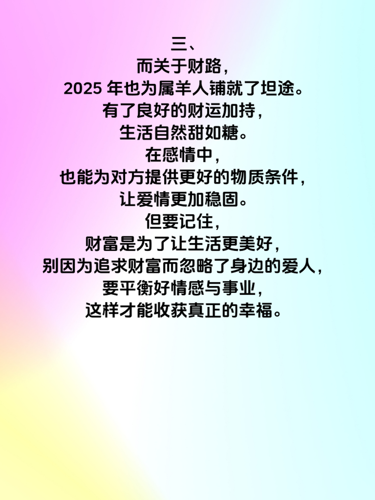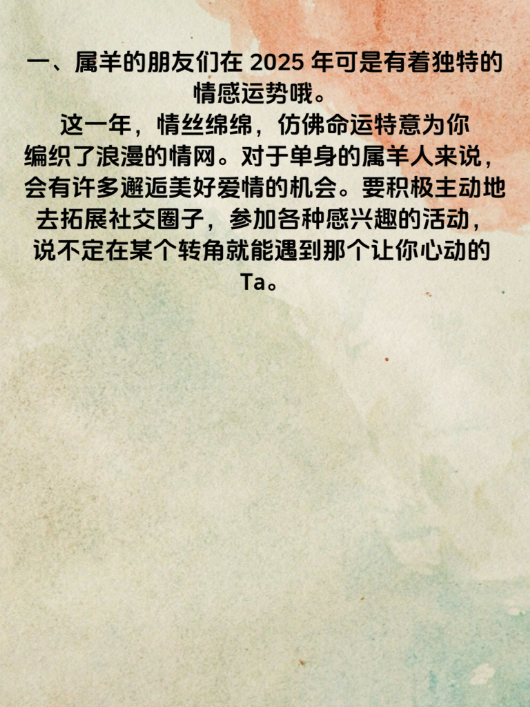 一、属羊的朋友们在2025年可是有着独特的情感运势哦。这一年,情丝绵绵,仿佛命运特意为你编织了浪漫的情网。对于单身的属羊人来说,会有许多邂逅美好爱情的机会。要积极主动地去拓展社交圈子,参加各种感兴趣的活动,说不定在某个转角就能遇到那个让你心动的Ta。 二、在追求爱情的道路上,真诚是永远的必杀技。展现出最真实的自己,不做作,不伪装。同时,注重自身形象和修养,提升内在魅力。当你以自信且温暖的姿态出现在对方面前时,更容易吸引到对方的目光。 三、而关于财路,2025年也为属羊人铺就了坦途。有了良好的财运加持,生活自然甜如糖。在感情中,也能为对方提供更好的物质条件,让爱情更加稳固。但要记住,财富是为了让生活更美好,别因为追求财富而忽略了身边的爱人,要平衡好情感与事业,这样才能收获真正的幸福。