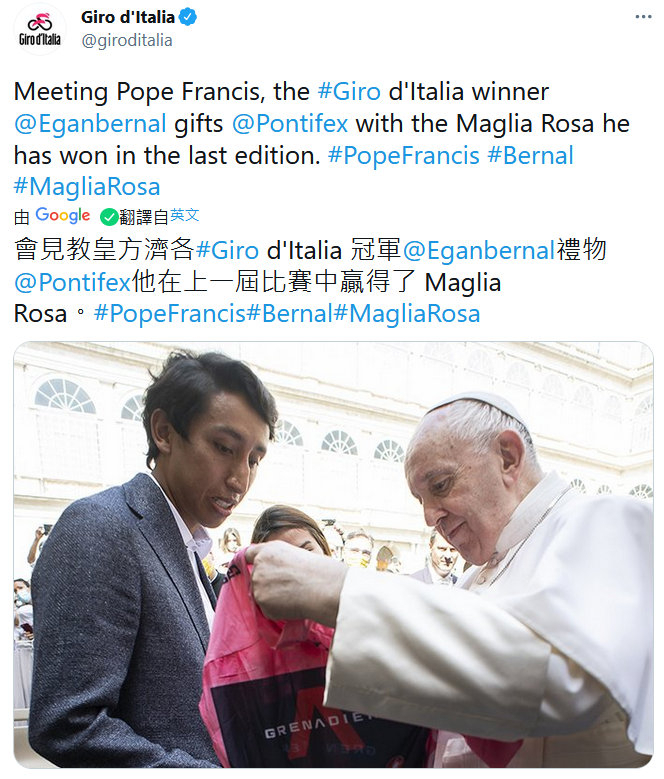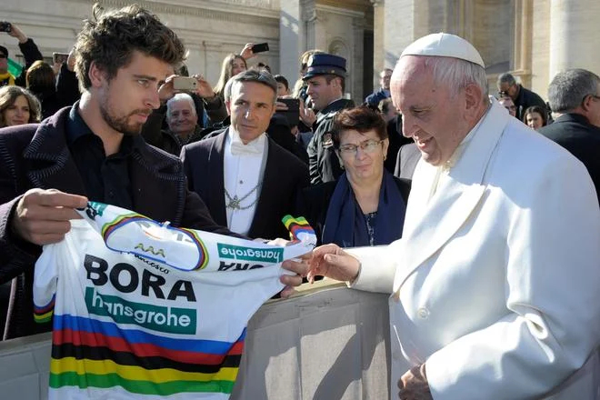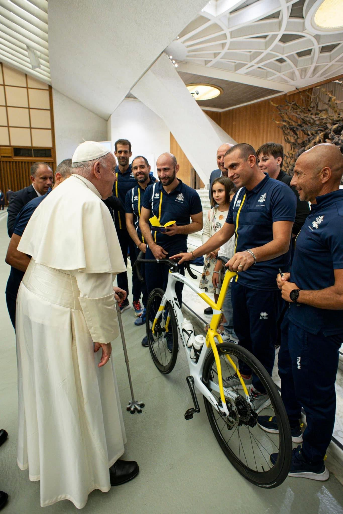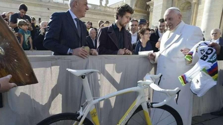 教皇方济各和自行车很有缘,萨甘、贝尔纳尔、阿尼奥利都曾拜见教皇,并赠送礼物