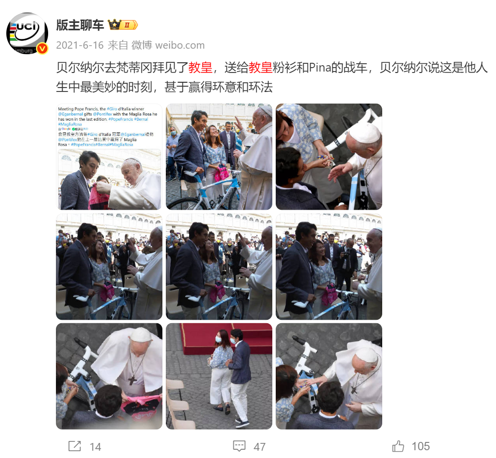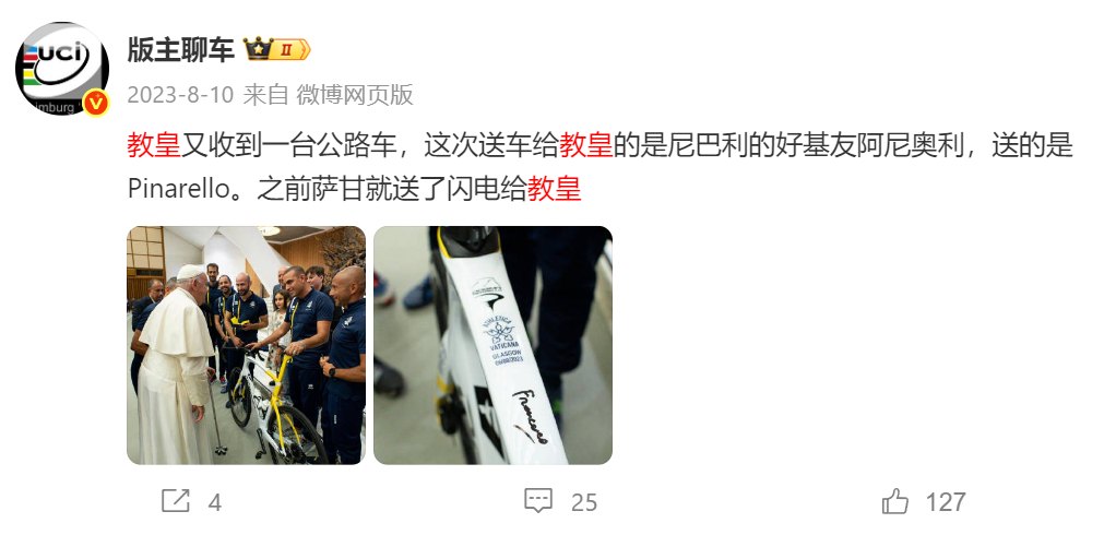 教皇方济各去世教皇方济各和自行车很有缘,萨甘、贝尔纳尔、阿尼奥利都曾拜见教皇,并