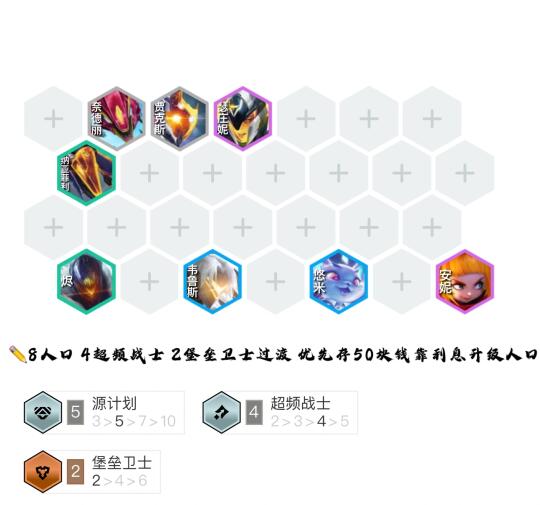 ✏️8人口 4超频战士 2堡垒卫士过渡 优先存50块钱靠利息升级人口