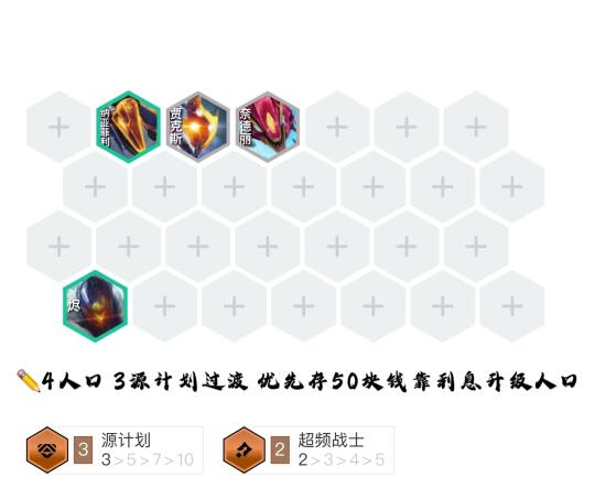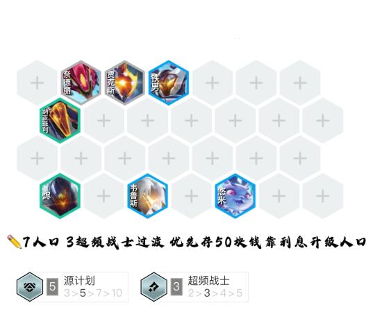 ✏️3人口 2超频战士过渡 优先存50块钱靠利息升级人口(注‼️如质量不高可选择连败吃经济优先拿装备)