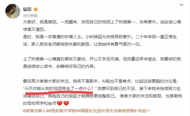 聋哑人宸玥的一句话非常合我的心思! 宸玥说:残疾不是剧本,AI脸也不是焦点,关键是,今天你能从我的视频带走了一点什么? 这句话充满了正能量,也说明她不想以残疾和漂亮为噱头,来博取流量,她有拍出给人以知识的视频、拍出给人以启发的视频的信心和决心。我非常期待! 同时她这种自立自强的精神,这种勇于奉献的精神,我觉得值得我们学习! 大家对我的上述言论有何看法?欢迎讨论! 图片来源于网络,侵权即删!