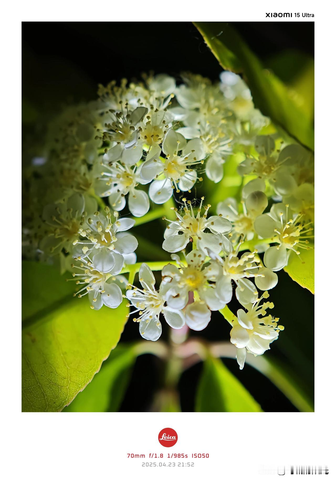石楠花的镜头美学 今天捕捉到了石楠花的美丽瞬间。从专业摄影角度看,这张照片有不少亮点。 一、光线运用 拍摄选用了柔和的光线,可能是在清晨或黄昏时分,避开了正午的强光。这种光线能让石楠花的色彩更饱满,花瓣细节也更清晰,还在花朵和叶片上营造出了迷人的光影效果,增强了画面层次感 。 二、构图技巧 构图上应该是用心安排过。可能运用了三分法等构图原则,让石楠花在画面中的位置恰到好处,看起来平衡又和谐。同时,背景的暗部处理,也让主体花朵更加突出,避免了画面的杂乱。 三、对焦精准 从照片能看出对焦很准确,石楠花的花瓣、花蕊都清晰锐利,背景适度虚化,形成浅景深效果。这不仅突出了主体,还营造出梦幻氛围,仿佛把石楠花从自然环境中单独“提取”出来展示 。 四、设备参数 这张照片是由Xiaomi 15 Ultra拍摄,标注的参数如70mm焦距、f/1.8光圈等,也为拍出这样出色的效果提供了硬件支持。大光圈带来浅景深,能更好地虚化背景突出主体 。 石楠花虽因气味被人熟知,但当我们用专业摄影视角去记录,会发现它在镜头下有着别样的美丽与魅力。 石楠花 摄影技巧