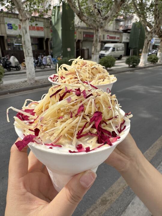 - 终于在南京吃到了奶渣蛋卷!!奶酪味特别浓郁,很上头。 贵州炒饭,加了酸菜和鲜牛肉,特别香 玫瑰乳扇酸奶,加了超多那啥玫瑰乳山丝,很特别。