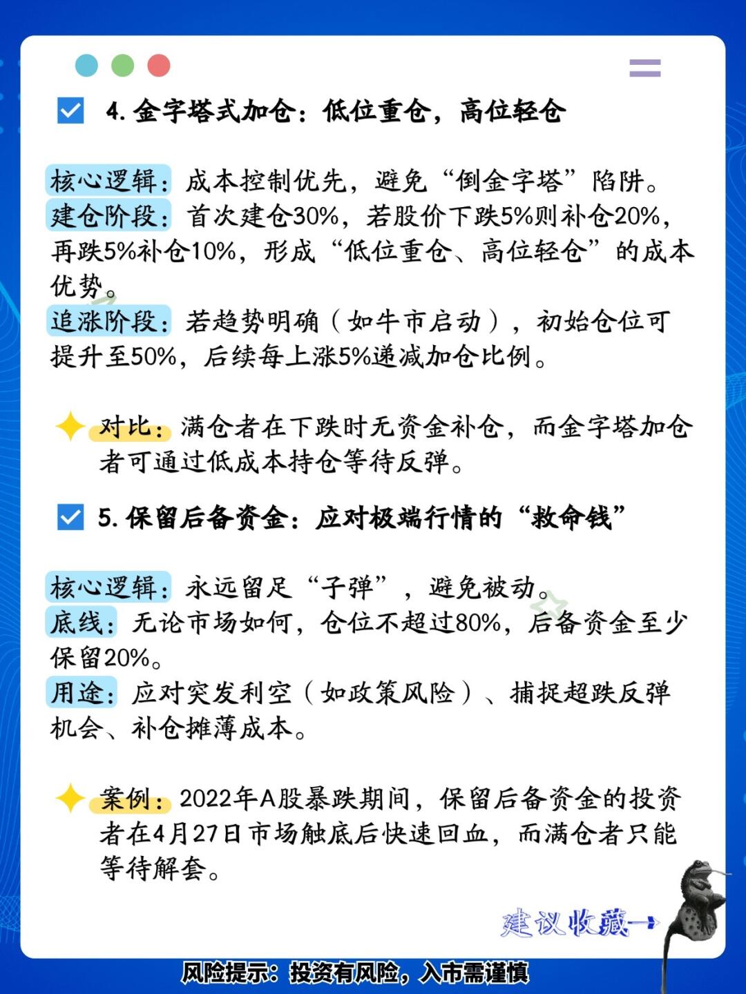 人生自由基金 天天满仓 不亏你亏谁?——5个科学控仓技巧,告别盲目满仓风险 在股市中,满仓操作看似能加大化收益,实则暗藏巨大风险。一旦市场转向,满仓者往往面临“割肉”或“踏空”的双重困境。以下结合实战经验与经典理论,总结5个有效控制仓位的技巧,帮助投资者在风险与收益间找到平衡。