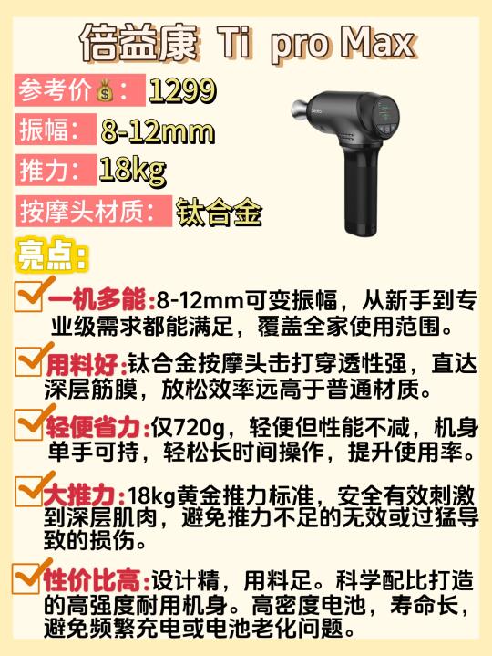 看来看去之后对比下来,我选了性能和价格都不错的倍益康Ti pro Max,它各方面都比较符合我的要求: