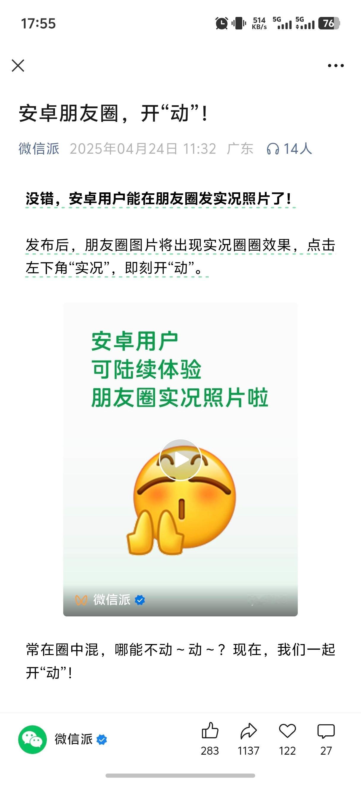 安卓朋友圈可发实况照片了安卓实况「live图」已经陆续推送了,大家要把把微信升级到8.0.58以上的版本;各大手机厂商都已经接入该功能,目前已经有部分用户体验上了,还有一部分没有,现在正陆陆续续推送中。