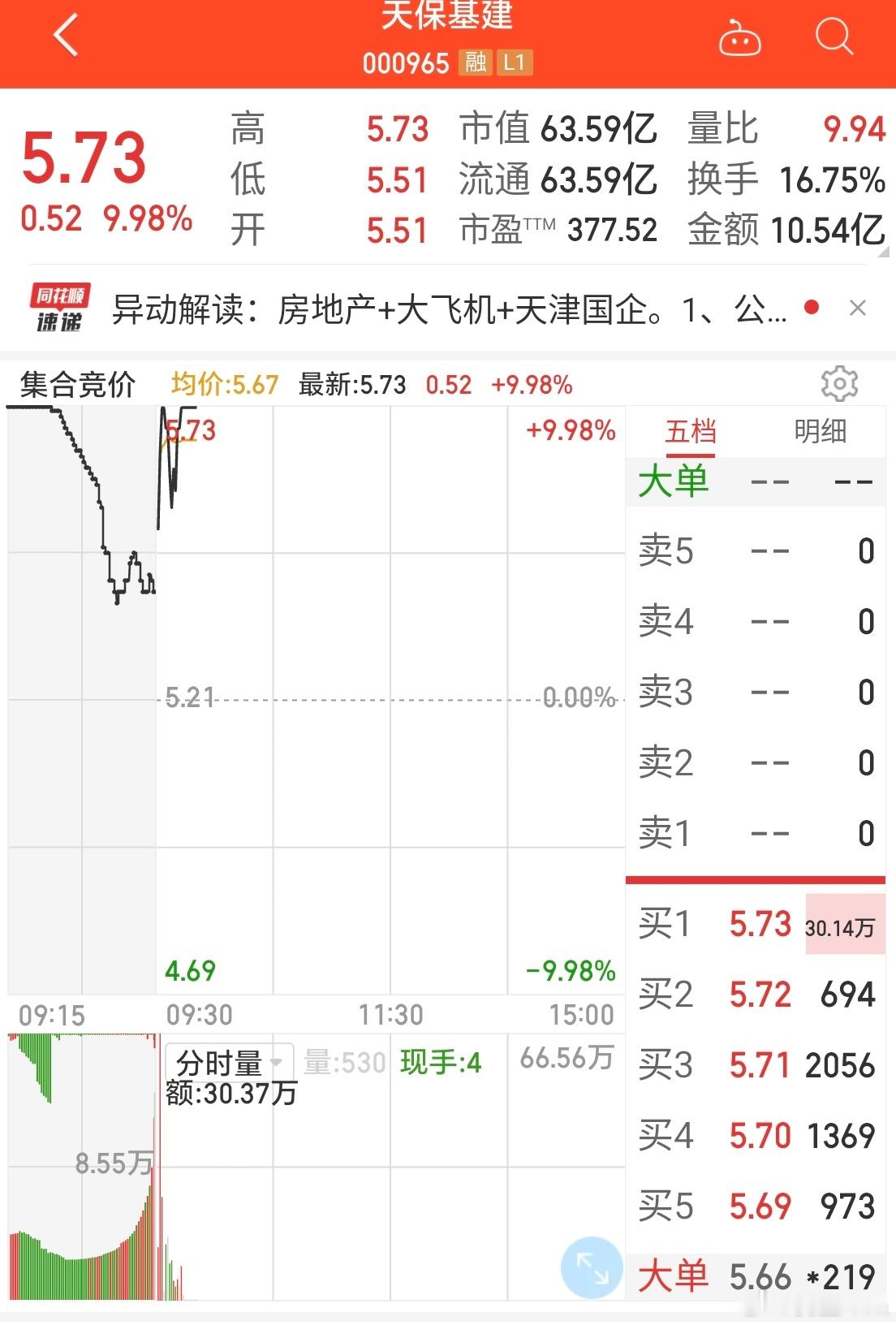 天保基建:竞价封板早盘再封板