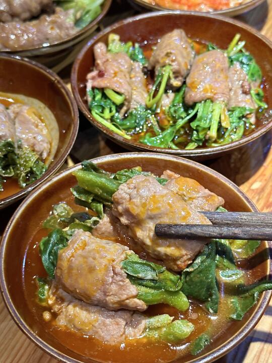 草本牛肉卷🥩一共有四种口味!牛肉包裹着薄荷/冰草/香菜/贡菜一下子就有春天的感觉了!烫熟以后牛肉口感鲜嫩加上爽脆的蔬菜尊嘟好好吃!尤其是薄荷的!吃起来满口清香!不蘸料都很香🤤