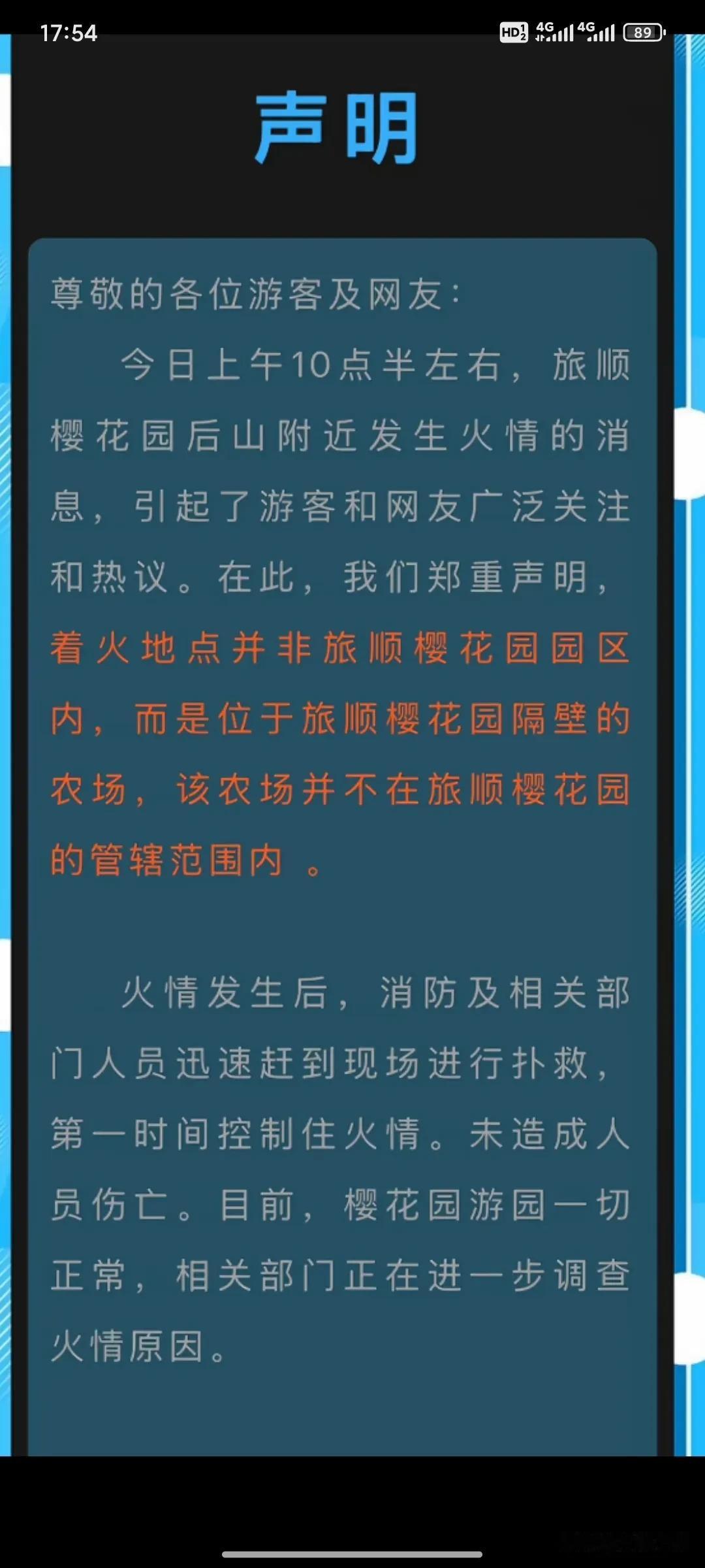 大连旅顺樱花园火情事件:一场有惊无险的“警钟” 嘿,各位朋友!昨天大连旅顺樱花园可是经历了一场“小风波”,好在结局是有惊无险。4 月 26 日上午十点,不少在樱花园游玩的游客突然发现园内浓烟滚滚,这可把大家吓坏了,纷纷拿出手机拍照发到网上,让这事儿瞬间在网络上引起关注。 当地消防部门可真是神速,接到警情后第一时间就出动了。他们就像一群英勇的战士,冲向火情现场,迅速展开扑救。没过多久,火情就被成功控制住了,真是让人松了口气!当天下午,旅顺文化旅游集团就发布了官方声明。声明里说,着火点其实并不在樱花园的管理范围内,而是后山的牧场里。消防部门还在抓紧调查起火原因,目前可以确定的是,这场火情没有造成人员伤亡,樱花园一切正常。 说到这儿,不禁想给消防部门点个大大的赞!他们反应迅速、扑救及时,避免了更严重的后果。同时,旅顺文化旅游集团也做得不错,及时通报情况,让公众能第一时间了解真相,而不是只能通过其他渠道瞎猜。 大连最近发布了好多次红色森林防火预警,天气这么干燥,防火这事儿可马虎不得。大伙儿进山游玩的时候,一定要牢记“不带明火、不吸烟”这条铁律,不然一旦引发火情,后果真是不堪设想。 这次旅顺樱花园的火情处理,给我们提了个醒。相关部门在面对这类突发情况时,要学习这种及时通报、迅速行动的处理流程。而且这次事件也反映出,作为自媒体从业者,在报道热点时,既要保证信息的准确性,也要注意及时性,等真相明朗后再报道,同样能发挥积极作用。 总之,希望相关部门能尽快查清这次火情的原因,避免类似安全事故再次发生。大伙儿出门游玩,尤其是去这种山林景区,一定要紧绷防火这根弦,让这样的惊险场面不再上演。对此你怎么看呢?欢迎来评论区一起说道说道,别着急划走,点个关注,不迷路。 春日生活打卡季发优质内容享分成