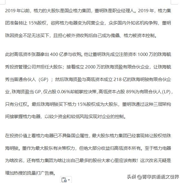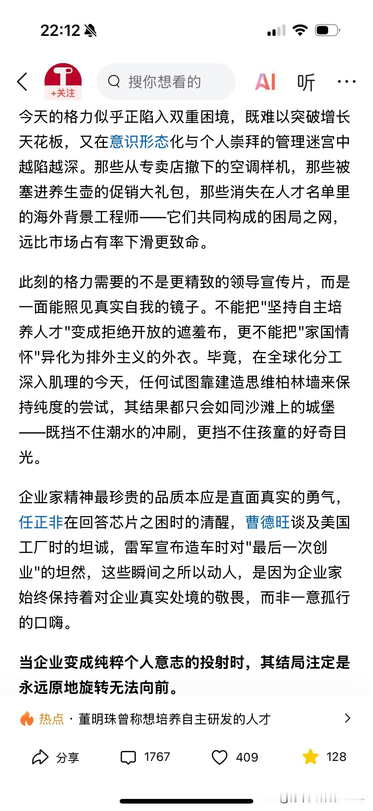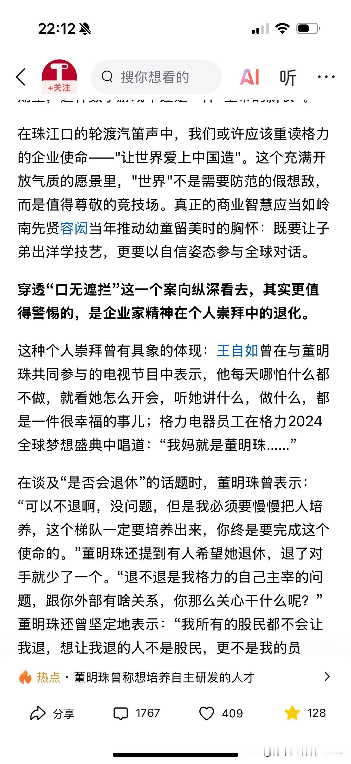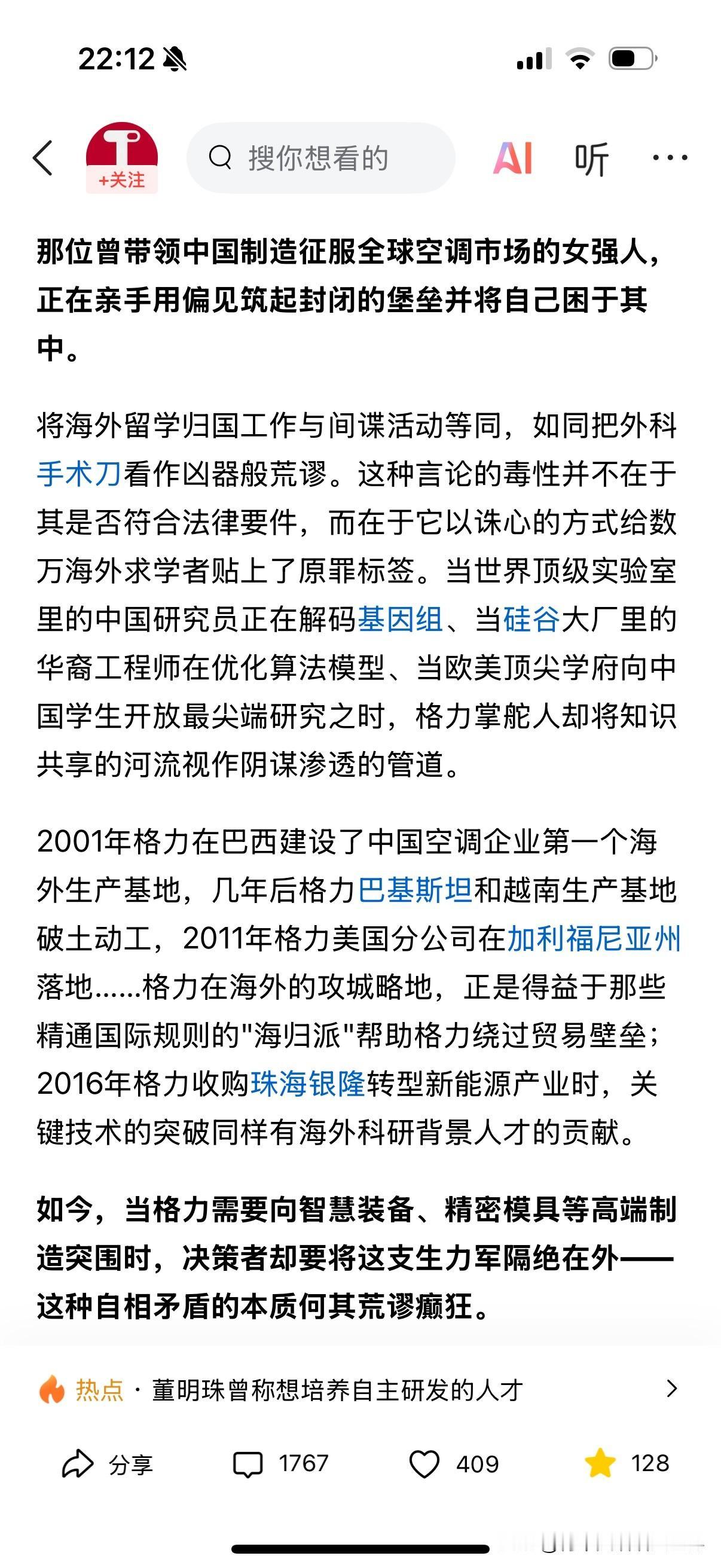 空调是美国人开利1906年发明的,日本的大金创立于1924,三菱创立于1921年,日立创立于1910年。它们至今占据全球市场。 格力呢?成立于1991年,从引进海外技术发展起来。我国家电发展难道不是得益于国外特别是日本技术的引进和转让?格力当时 不是和大金签订了协议,董大妈那笑容都谄媚着呢。 董大妈说的“有间谍所以不用海归”,引起千层浪。官媒和一些大咖纷纷与董大妈对立反驳,比如九边、龙教授、胡锡进(这次我少有站队他)、储殷等,而一些所谓的百姓都争相为董妈叫好,说这是什么“骨气”,然后这帮人就转而嘲讽留学生团体,一副羡慕嫉妒恨的样子彰显无遗。董大妈是懂流量的,她变成了和同龄的司马夹头同样的嘴脸。 董大妈把这个国有企业卖给了私人,自己成为私企掌权人得了几亿股票,怎么没有骂?反而争相去骂留学生。 在全球前100的大学里读书的本科或硕士留学生们,其实都是认真的,国外正规大学进入也是有门槛的,同时是严出,自己学习和生活,完全陌生的环境,独立自主学习和考试,解决各种问题,本身就需要非一般的能力和承受力。要说没能力?这就是能力:独自担当的能力。 那些嘲讽国外大学水的人们,难道国内大学就不水了?那些本科生,如果不是有考研(出国或国内)的想法,哪个不是坐吃混日子,混张本科文凭?而那些本科要出国读研的学生,拼命努力提GPA分数和学雅思,这怎么能说留学生不努力呢? 华为等企业有许多海外归国成员,许多学校也有海外回来的老师,他们都在国内努力工作,那些支持董大妈的人们你们又有什么贡献?你们除了协助董大妈挑动对立和反智愚昧,还有什么价值?从这里就看出“恨人有笑人无”的劣性及“人斗人”那恰逢董大妈形成人生观的青年时期的那个年代的愚昧烙印。 乱扣帽子,歧视和民粹,自嗨和歪曲。可叹,令人警醒。