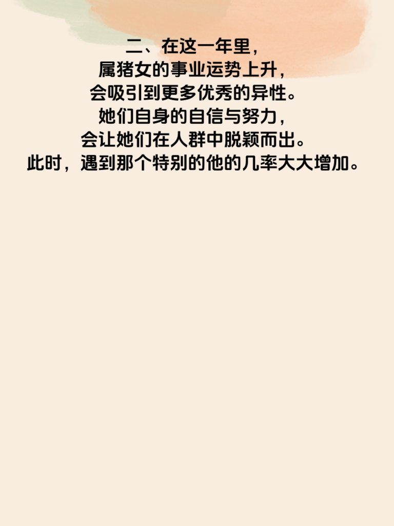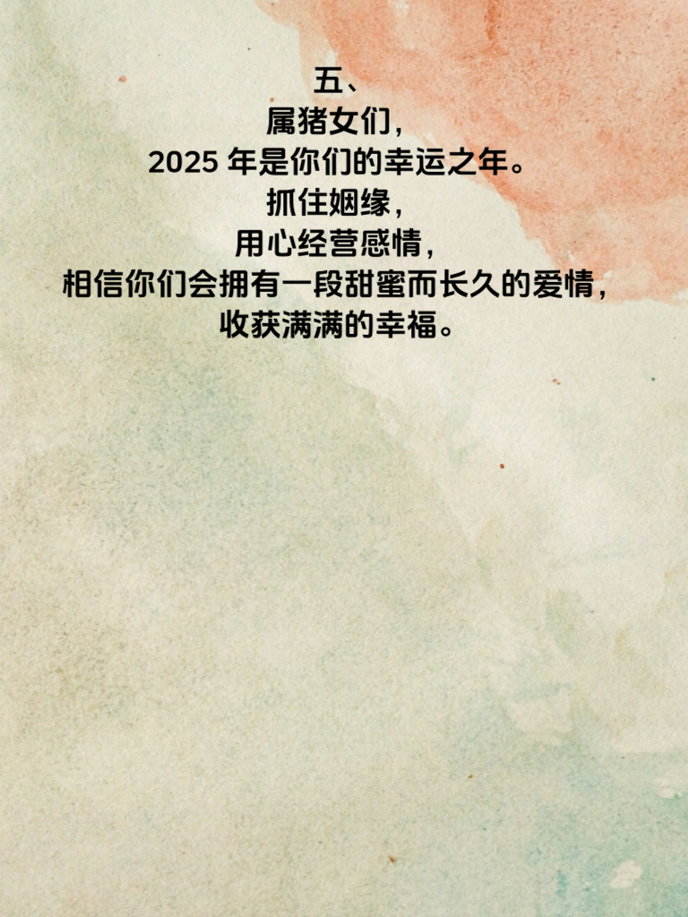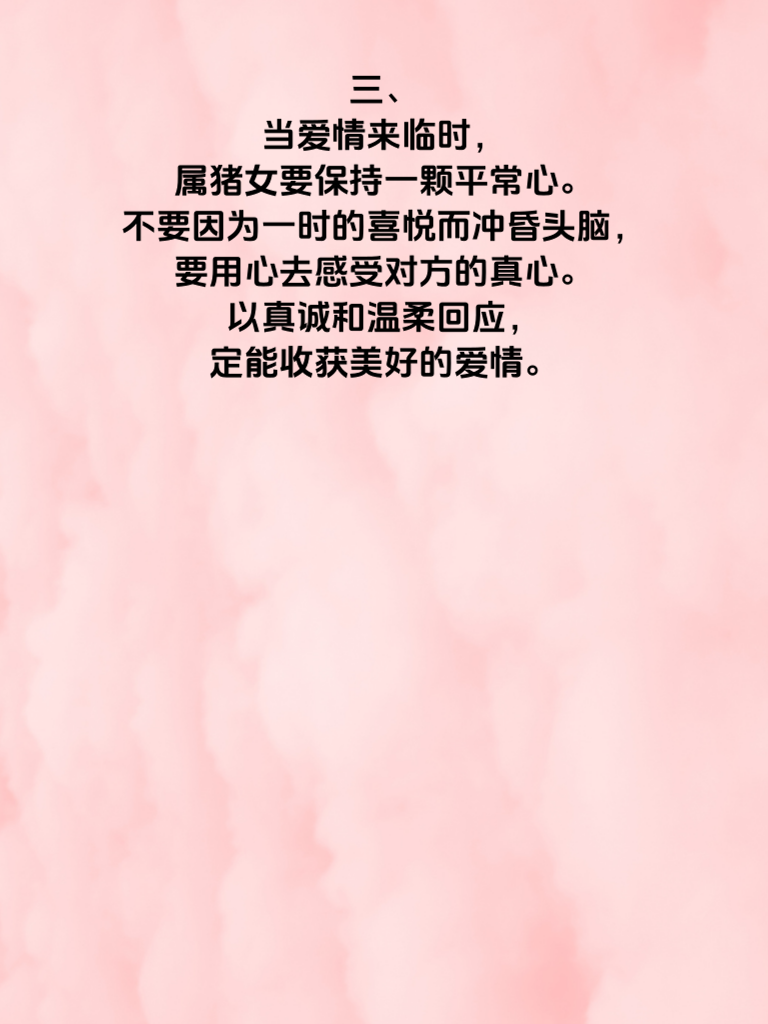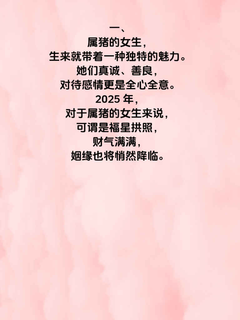 一、属猪的女生,生来就带着一种独特的魅力。她们真诚、善良,对待感情更是全心全意。2025 年,对于属猪的女生来说,可谓是福星拱照,财气满满,姻缘也将悄然降临。 二、在这一年里,属猪女的事业运势上升,会吸引到更多优秀的异性。她们自身的自信与努力,会让她们在人群中脱颖而出。此时,遇到那个特别的他的几率大大增加。 三、当爱情来临时,属猪女要保持一颗平常心。不要因为一时的喜悦而冲昏头脑,要用心去感受对方的真心。以真诚和温柔回应,定能收获美好的爱情。 四、同时,在感情中要学会适度地展现自己的小脾气,这并非无理取闹,而是一种别样的可爱。让对方更加了解真实的你,增进彼此的感情。 五、属猪女们,2025 年是你们的幸运之年。抓住姻缘,用心经营感情,相信你们会拥有一段甜蜜而长久的爱情,收获满满的幸福。