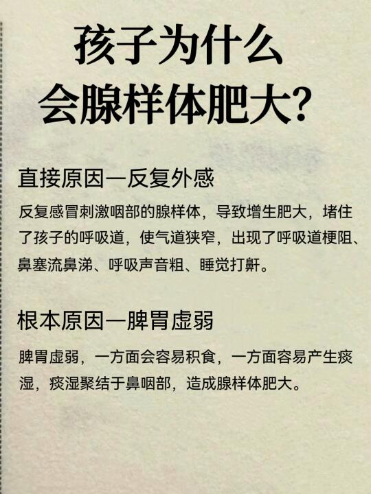 反复的外感,很容易刺激咽喉部的腺样体,导致增生肥大,从而堵住了宝宝的呼吸道,使气道狭窄,出现上呼吸道梗阻、鼻塞、流涕、呼吸声音粗、睡觉打鼾。