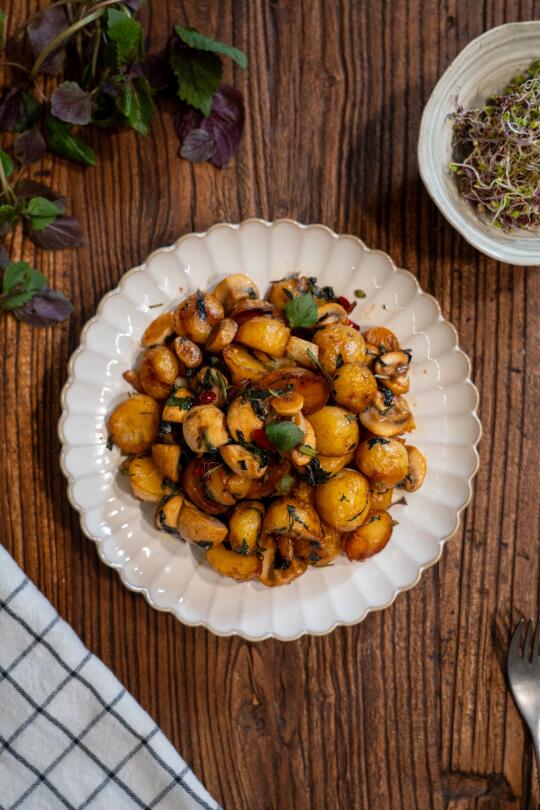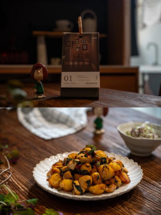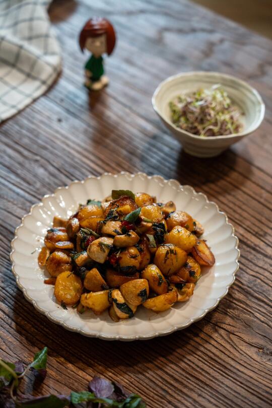 迎来小长假 在家好好吃饭和休息 🍃🍊🍄🍆🥬 今天分享一款土豆新吃法 食材:土豆/蘑菇/紫苏/辣椒 做法: 1、土豆去皮压扁,大的对切,蘑菇横竖对切成4块; 2、沸水里煮5分钟,捞出沥干; 3、锅里放油,倒入土豆煎到金黄,加蘑菇继续煎一会; 4、放入大蒜、小米椒和紫苏,翻炒均匀; 5、出锅前调味就好啦。 🍃 五月,是暮春,也是新生,愿我们在季节的转角遇到爱,遇到温暖,遇到希望~
