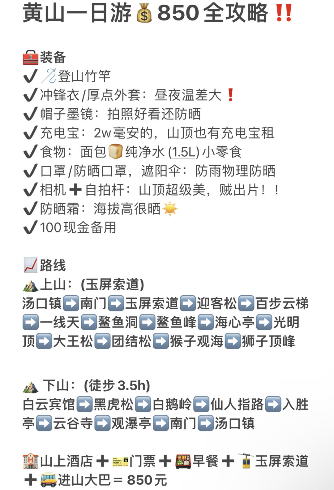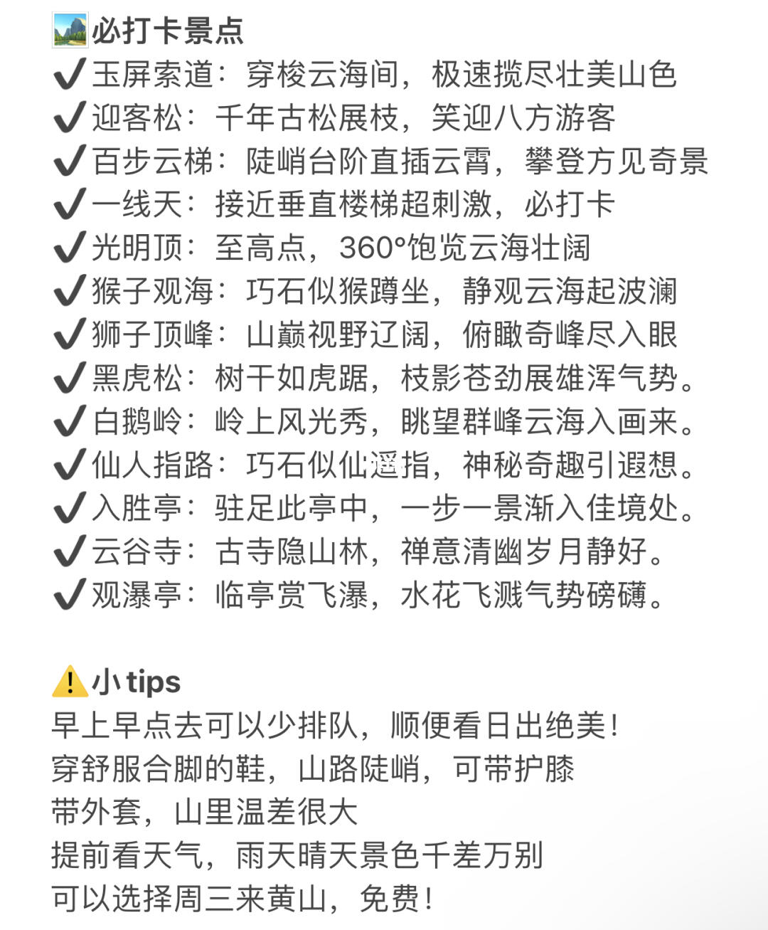 汤口镇➡️南门➡️玉屏索道➡迎客松➡️百步云梯➡️一线天➡️鳌鱼洞➡️鳌鱼峰➡️海心亭➡️光明顶➡️大王松➡️团结松➡️猴子观海➡️狮子顶峰