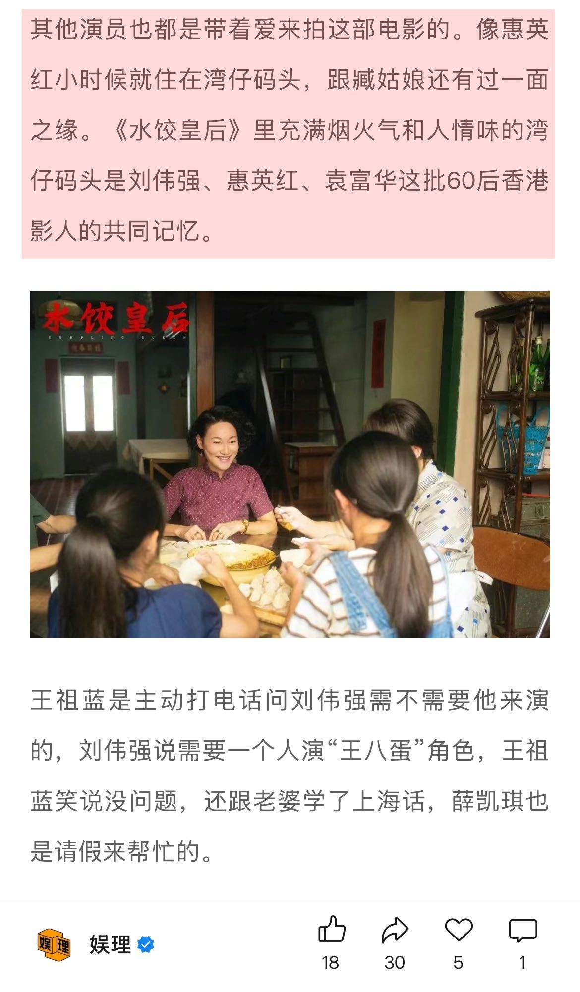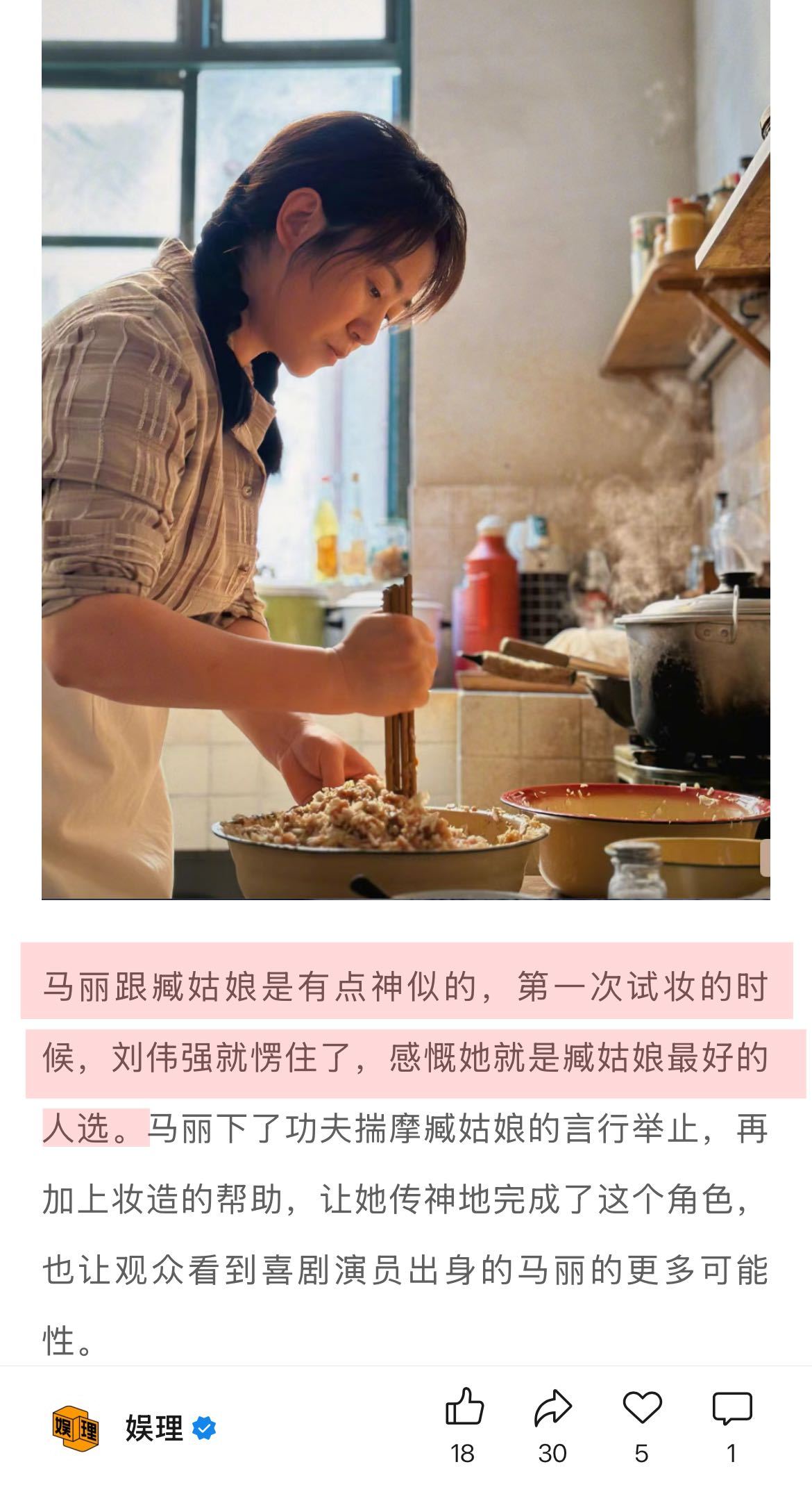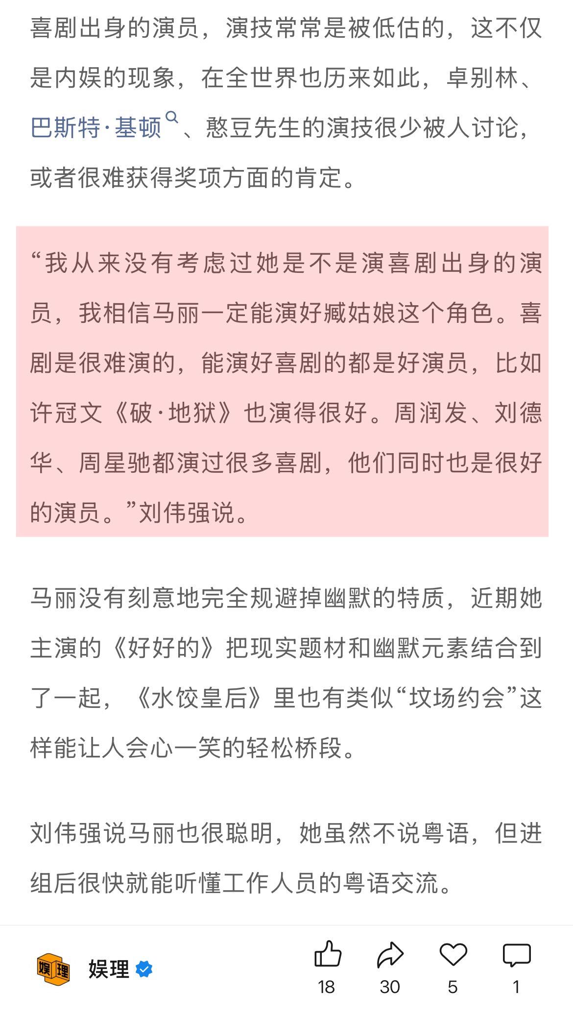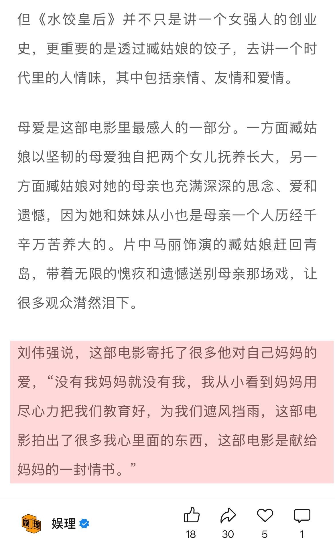 刘伟强说马丽是水饺皇后最好的人选水饺皇后是献给妈妈的情书 首次试妆时,刘伟强就感慨她是《水饺皇后》臧姑娘最好的人选。“我从来没有考虑过她是不是演喜剧出身的演员,我相信马丽一定能演好臧姑娘这个角色。喜剧是很难演的,能演好喜剧的都是好演员。”娱理独家↓