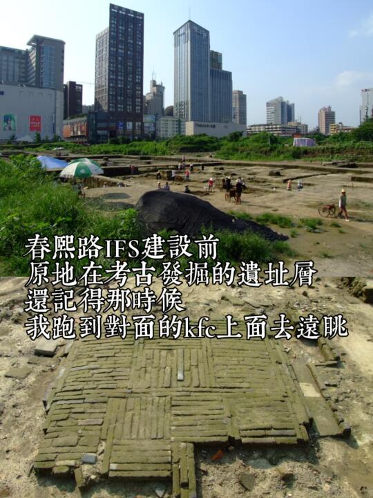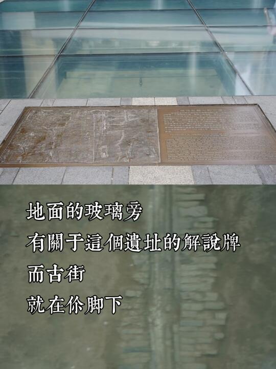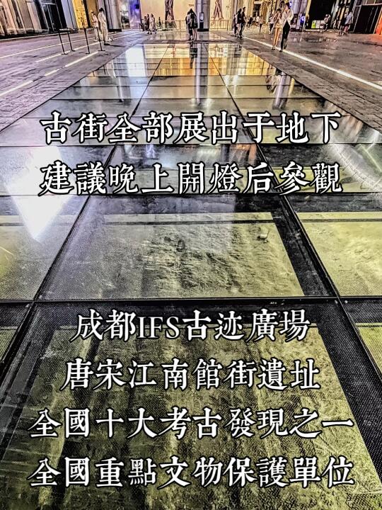 这个遗址的全名叫“江南馆街唐宋街坊遗址”,是曾经的“全国十大考古新发现”之一,也是全国重点文物保护单位。 . 但绝大多数来到IFS的人没有发现它的存在。 . 它静静地呆在IFS“古迹广场”正下方,一排排巨型的玻璃之下,白天非常不易注意到它,而到了夜晚,遗址层的灯光会打开,这时候站在玻璃上,可以很清晰地看到里面综合交错的唐代、宋代千年古街,甚至千年排水管。 . 图一是成都考古中心对这处遗址构造的展示,在春熙路IFS的高楼大厦和爬墙熊猫之下,叠压着千年古街的遗址,遗址之下,便是真正的古代成都。