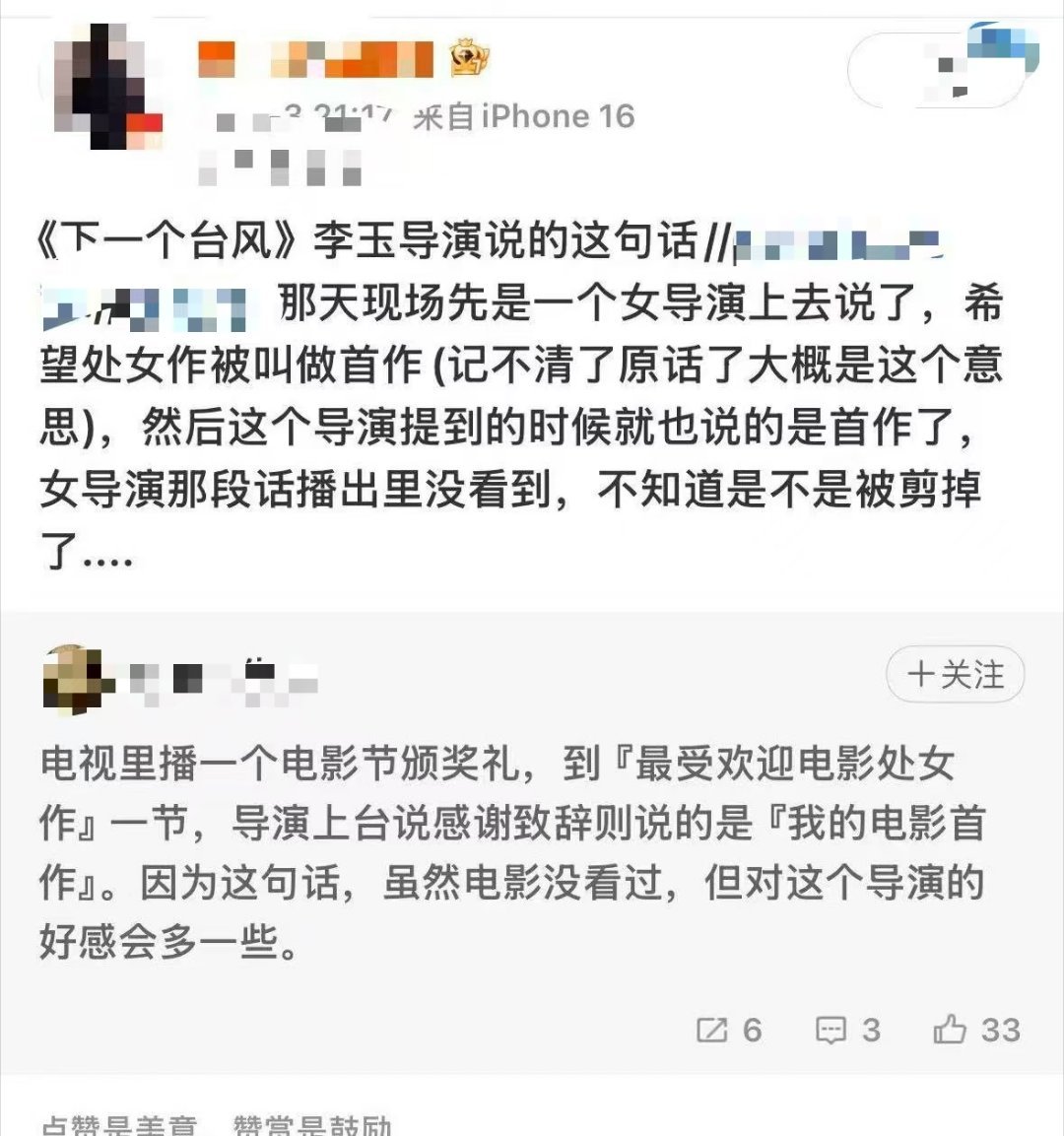 谁懂李玉导演那句“说出来就舒服了”,女性在面对令自己不适的场景,很多时候是不被鼓励大声说出真实想法的,女性的语言失权被困在刻板印象里太久了,“处女作”这个表述的不适在最近越来越多地被女性创作者和女性题材作品们提及,她们觉察,她们发声,这就是为什么我们需要更多的女性上桌的意义吧!《下一个台风》上映的时候会支持李玉导演!