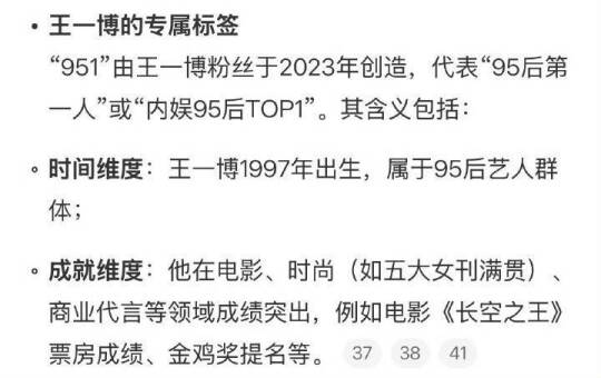 951 首先,951这个词,起源是王一博粉丝,玫瑰小姐姐提出的概念词啊。那是王一博,95后,第一名,从音乐,舞台,综艺,电影,电视剧,时尚,粉丝,商务代言,主持,获奖,跨圈破圈,户外运动,纪录片,赛车,社会正能量,红歌,国际影响力……多方面、全方位的影响力第一。 其实,不是一个level的井底之蛙也想来宇宙碰瓷,本不想给眼神,一笑而过,没想到人家那么无知……那么就把请把脸凑过来吧~