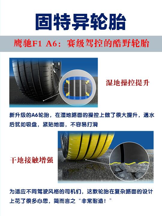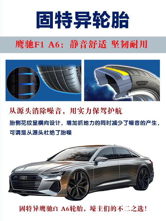 ⭕️朋友的原厂胎是某米,胎面非常软、舒适但就是不太耐磨,这也就解释了为啥才跑3万多公里就花纹见底了,他说有次🌧️雨天走高速,路面积水,车子飘过去的时候给他吓一哆嗦,回来就赶紧安排了检测保养。其实奥迪系列的车型属于对操控要求比较高的,轮胎首先要考虑抓地力好、耐磨,所以对比了一圈(图5️⃣),他还是选择了固特异鹰驰F1 A6系列,⚠️就一个原因:它是专门针对奥迪A6等豪华车的高性能轮胎!换上之后,兄弟们!就是你能明显感觉到那个抓力的与众不同,那种脚踏实地的安全感,就像个吸盘牢牢抓在地上,加上酷野的造型,我就不由得感叹:有赛道基因的果然不一样‼️