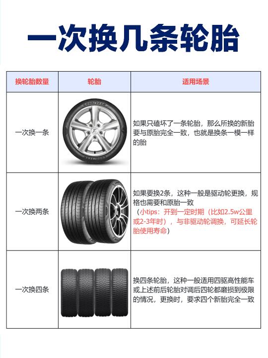 ③换四条轮胎,这种一般适用四驱高性能车或四轮都磨损到极限的情况,要求四个新胎完全一致