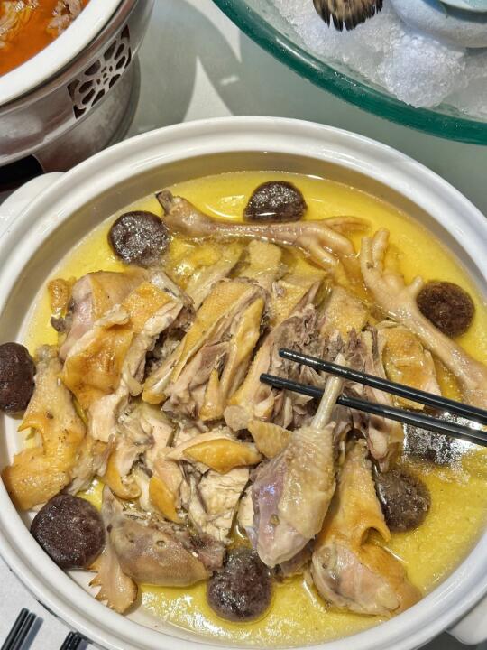 汤色金黄油亮,鸡肉口感紧实弹牙~