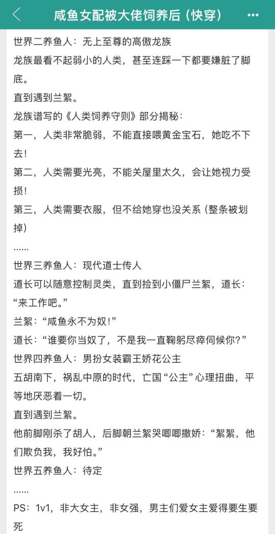 咸鱼女配被大佬饲养后(快穿) 系统特别护犊子,替宿主修仙,考到功法证;替宿主读书,想考状元;替宿主运营账号,卖货赚生活费;替宿主工作,大战AI。 女主坚持咸鱼躺平,把热血战斗世界咸成休闲田园,但该冲的时候绝不拖后腿,爱躺却不误事。 男主擅长自我攻略,爱女主是深入骨髓的。 小世界设定很丰富,男扮女装、女扮男装、人鱼、狼孩、道士僵尸、龙、叔嫂,等等,没有雷同。