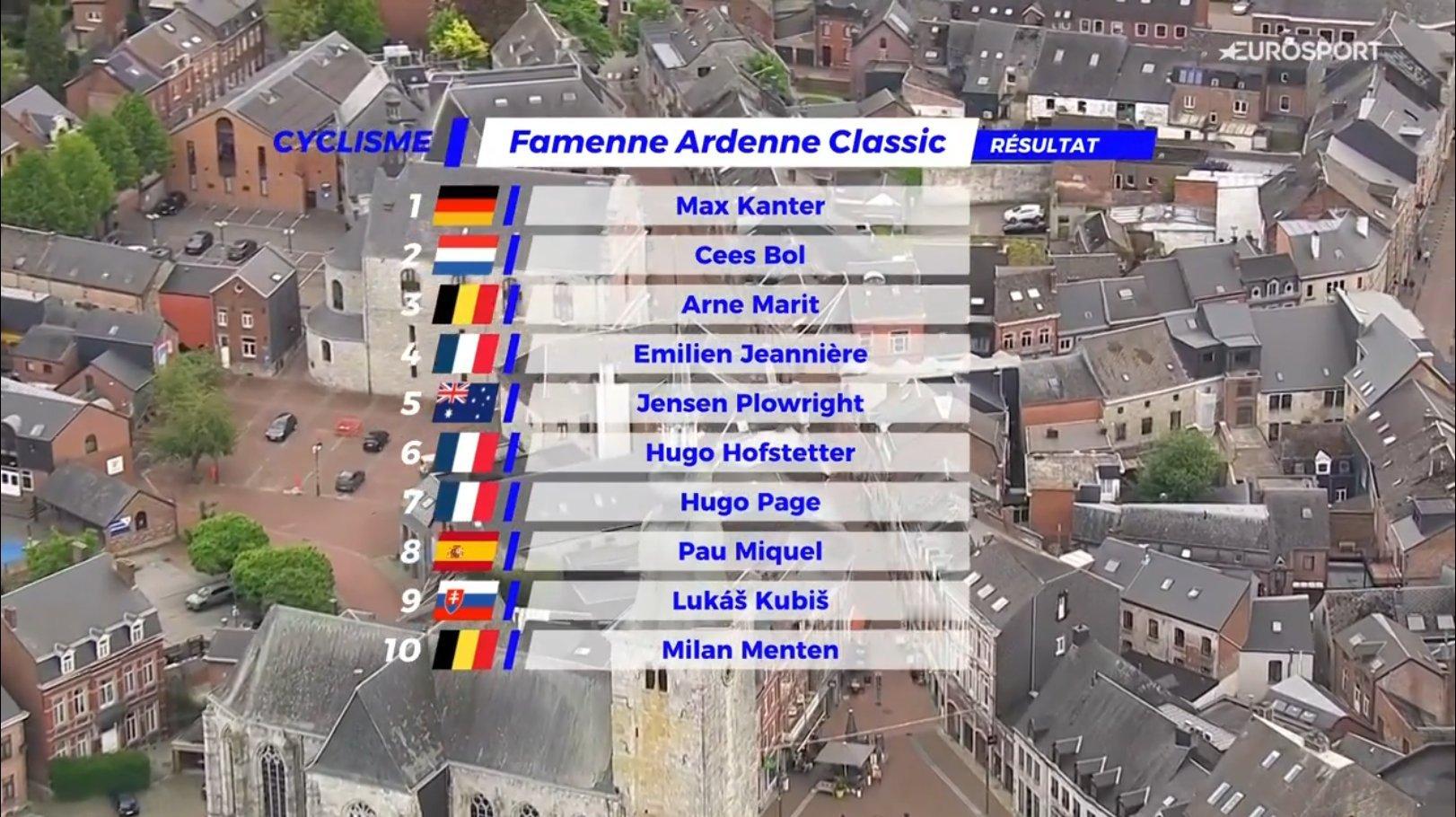 法梅讷阿登经典赛 坎特冲刺夺冠。没看到有录像或视频, 坎特和塞斯-波尔包揽了前两名,马里特第三。XDS-阿斯塔纳六天七胜,一天之内获得三场胜利。大丰收的一天