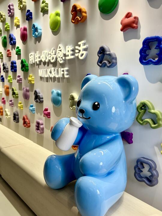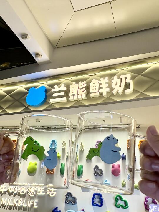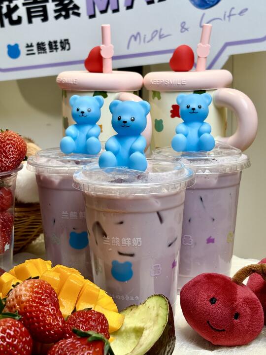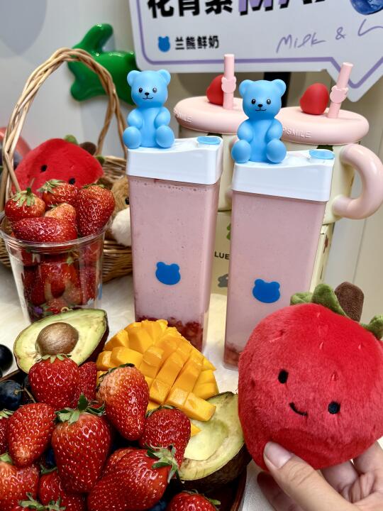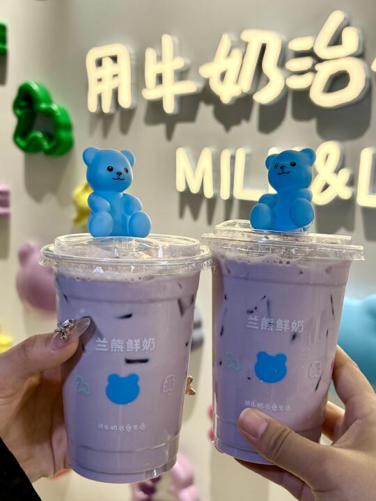 之前路过万象城看到兰熊鲜奶的围挡就很馋了~ 这么多天没白盼,五一小长假终于喝上了!根本不用跑去北京!🥛牛奶主题乐园拍照好出片! - 🍓草莓🍇葡萄脑袋快冲葡萄冰奶和焕颜草莓酸奶! 两杯都是0蔗糖,好喝没负担!还有超可爱的🐻小熊玩偶,快和姐妹一起来打卡!