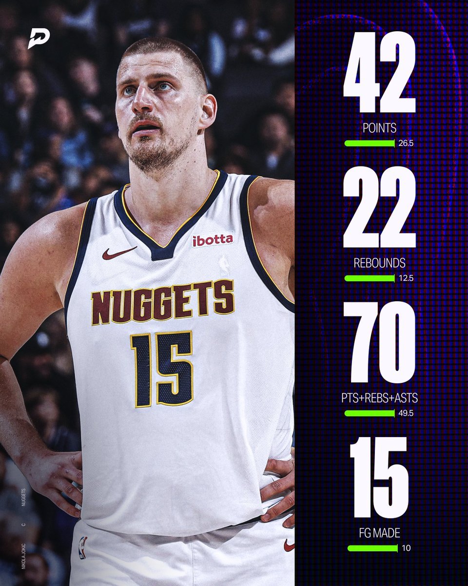 全场比赛,约基奇上阵42分25秒29投15中,三分6中2、罚球13中10,狂轰42分22篮板6助攻1抢断2盖帽,出现7失误、5犯规,正负值+10。