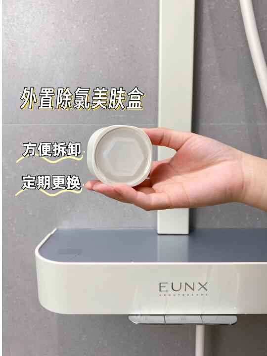 它拥有外置除氯美肤盒,可以把水中的余氯转化为无害物质,洗完澡皮肤都变得滑溜溜的,不会再干痒难受。透明的外壳设计,脏了可以随时更换✔
