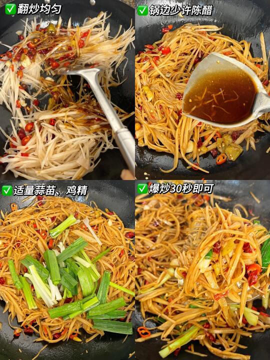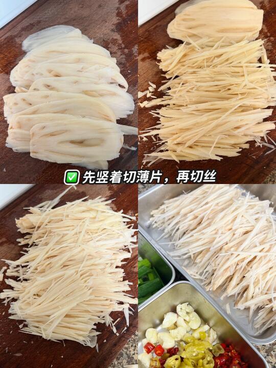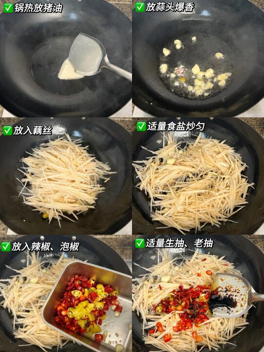是谁还没试过这个酸辣藕丝[赞R][赞R]求你们快去做,5分钟搞定,手残党也能秒变大厨~ 🍀食材:莲藕、辣椒、泡椒、蒜头、蒜苗; 👇做法: 1、莲藕切薄片,再切丝,锅热放猪油,油热放蒜末爆香,放莲藕丝、盐炒匀; 2、放辣椒、泡椒、生抽、老抽翻炒均匀,锅边一圈陈醋、适量蒜苗、鸡精大火炒30秒即可;