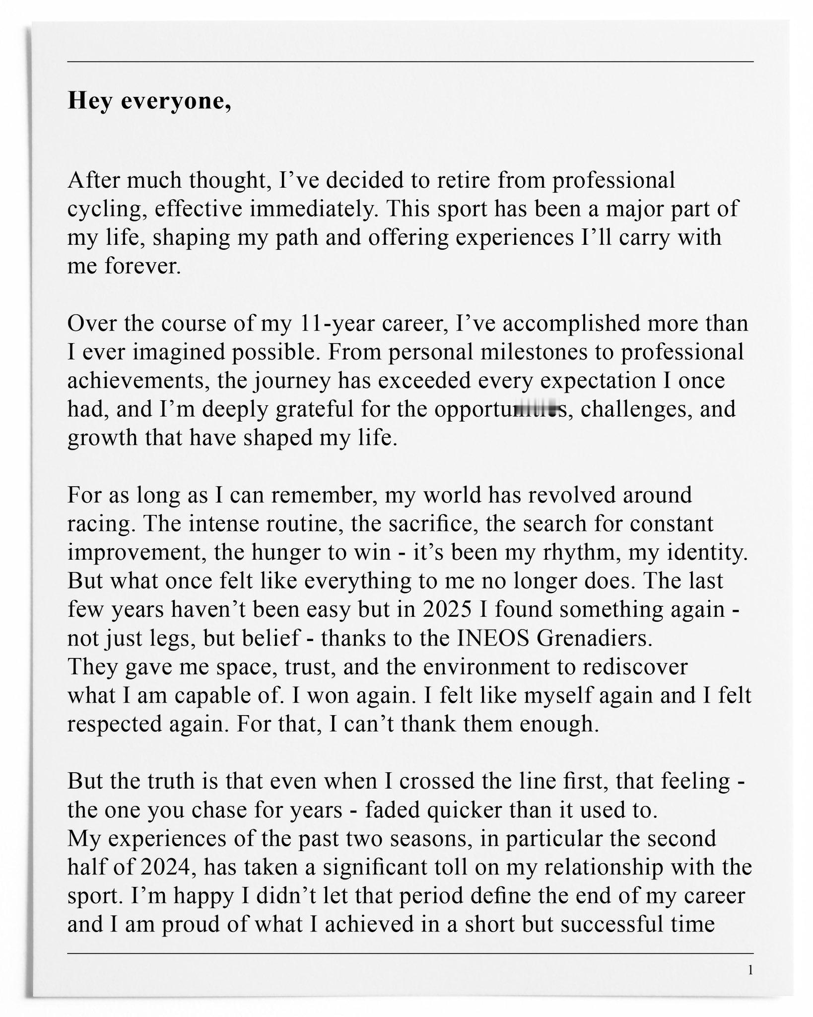 尤安宣布今日退役。他说现在获胜的感觉已经不如以往,很快就消退了。而前两年的经历(尤其是去年下半年)让他与自行车运动的关系破裂,之前说他要退役的传言不是空穴来风。尤安说这是一段疯狂的旅程。遥想当年他出道的时候,那个低风阻冲刺姿势,也是他个人的标志了