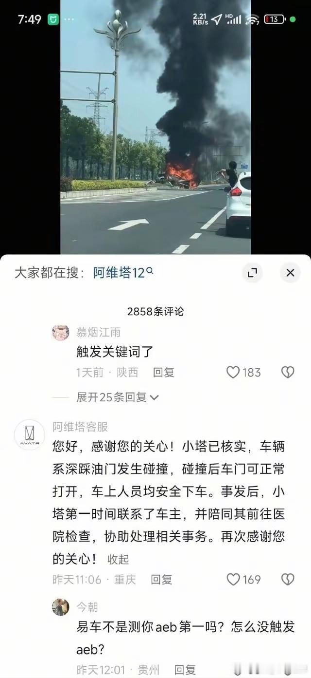 阿维塔作为新能源高端汽车品牌,一直强调车辆的安全性与品质。若此次事件属实,妥善处理是展现品牌担当的关键,积极调查事故原因、保障车主权益,向公众透明公开处理进程,才能重塑消费者信心;若事件不属实,官方应迅速澄清,避免不实信息持续发酵损害品牌形象。毕竟在信息传播迅速的当下,及时准确的发声对维护品牌公信力至关重要。