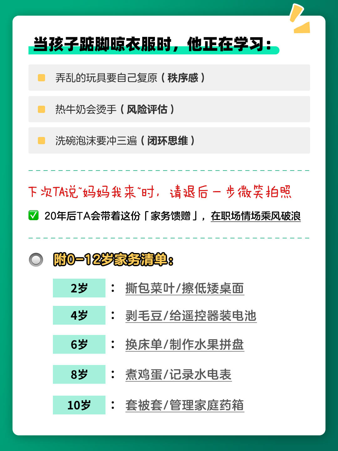 哈佛追踪20年的研究揭露真相: 爱做家务的孩子 成年后薪资高4倍 失业率低15倍 别急着承包所有家务 这三个阶段放手 养出超强责任感宝宝👇 孩子教育 育儿 家庭教育