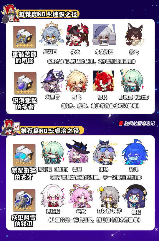 大家早上中午晚上好,我是随风 本周五(5月9日)隧洞遗器双倍来啦,3.2版本推荐刷这些本 第一个弦歌之径,适合抽遐蝶,以及养缇宝、阿雅和记忆主的玩家 第二个霜风之径,风套非常通用,也是那刻夏和忘归人的一种选择 第三个勇骑之径,适合抽飞霄和忘归人,以及练击破队的玩家 第四个迷识之径,适合抽那刻夏,以及养大黑塔和万敌的玩家 第五个睿治之径,是输出那刻夏的一种上限比较高的选择